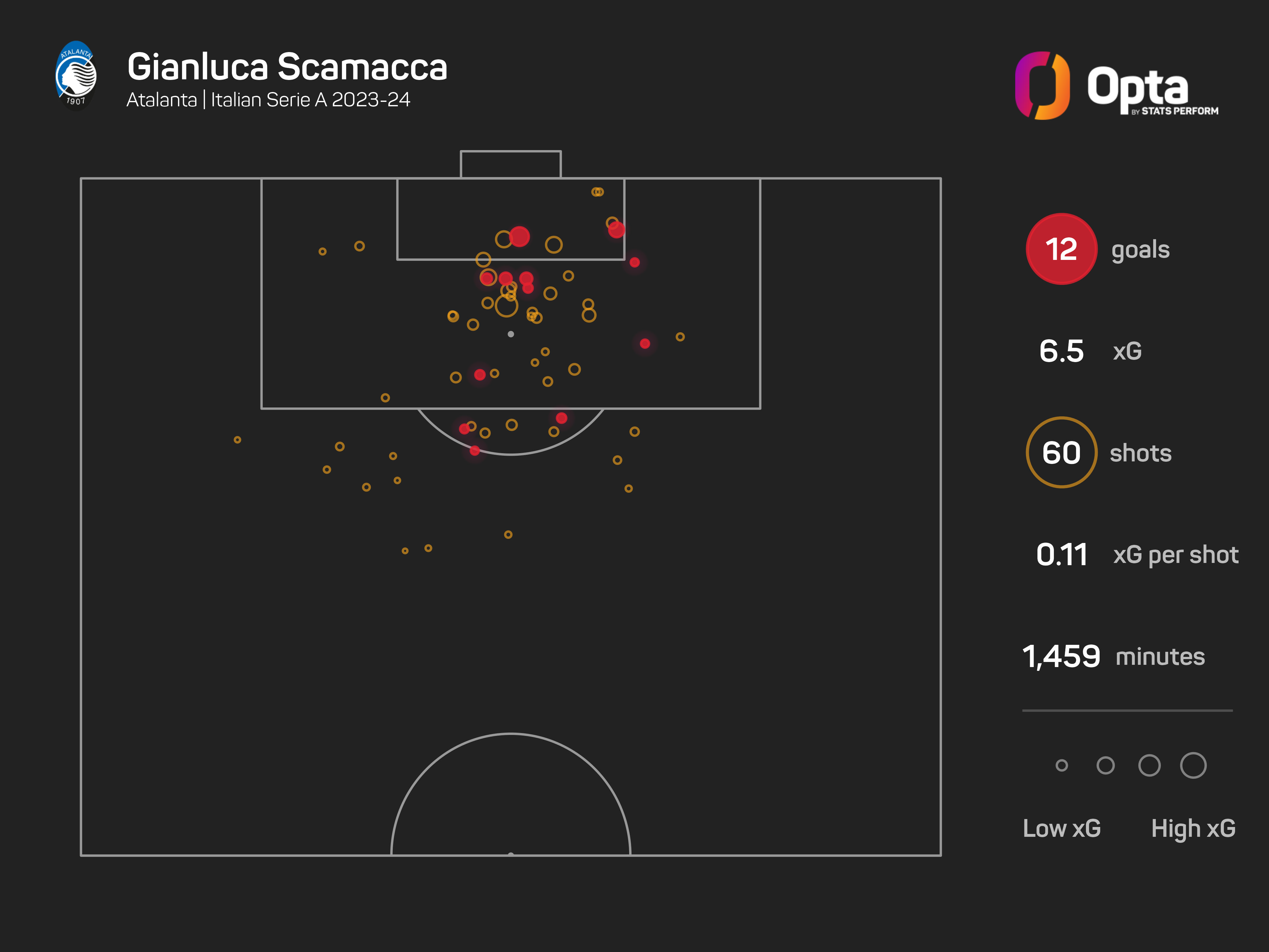 In Serie A, Scamacca scored 11 times from chances worth just 6.54 expected goals (xG), with only Lautaro Martinez (+6.36) and Teun Koopmeiners (+5.47) overperforming their underlying figures by a greater margin than him (+5.46).