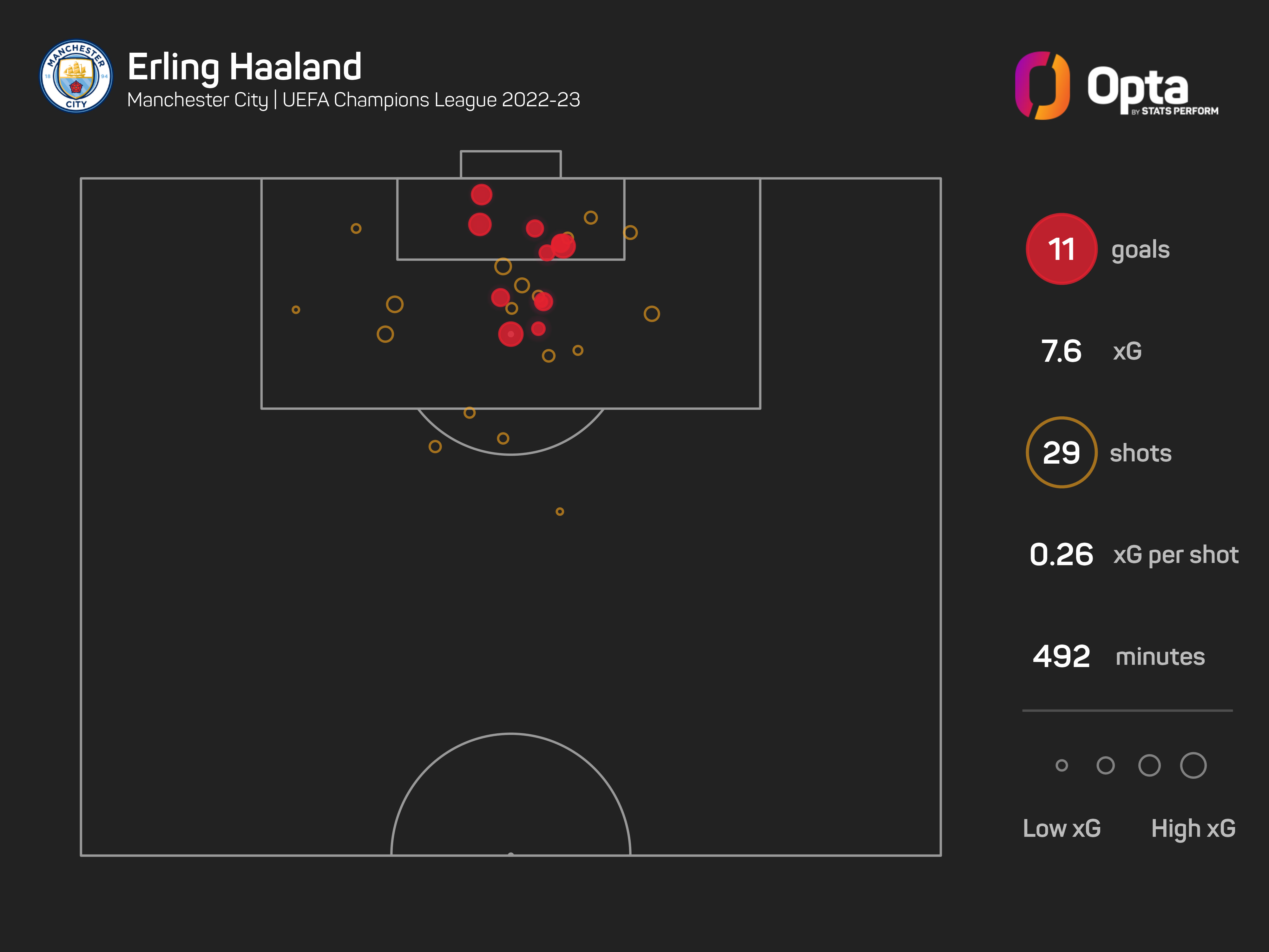 Haaland has scored 11 Champions League goals for City this season, his best return in a single campaign, and just one behind the season record for a Premier League player in the competition (Ruud van Nistelrooy, 12 in 2002-03 for Manchester United).