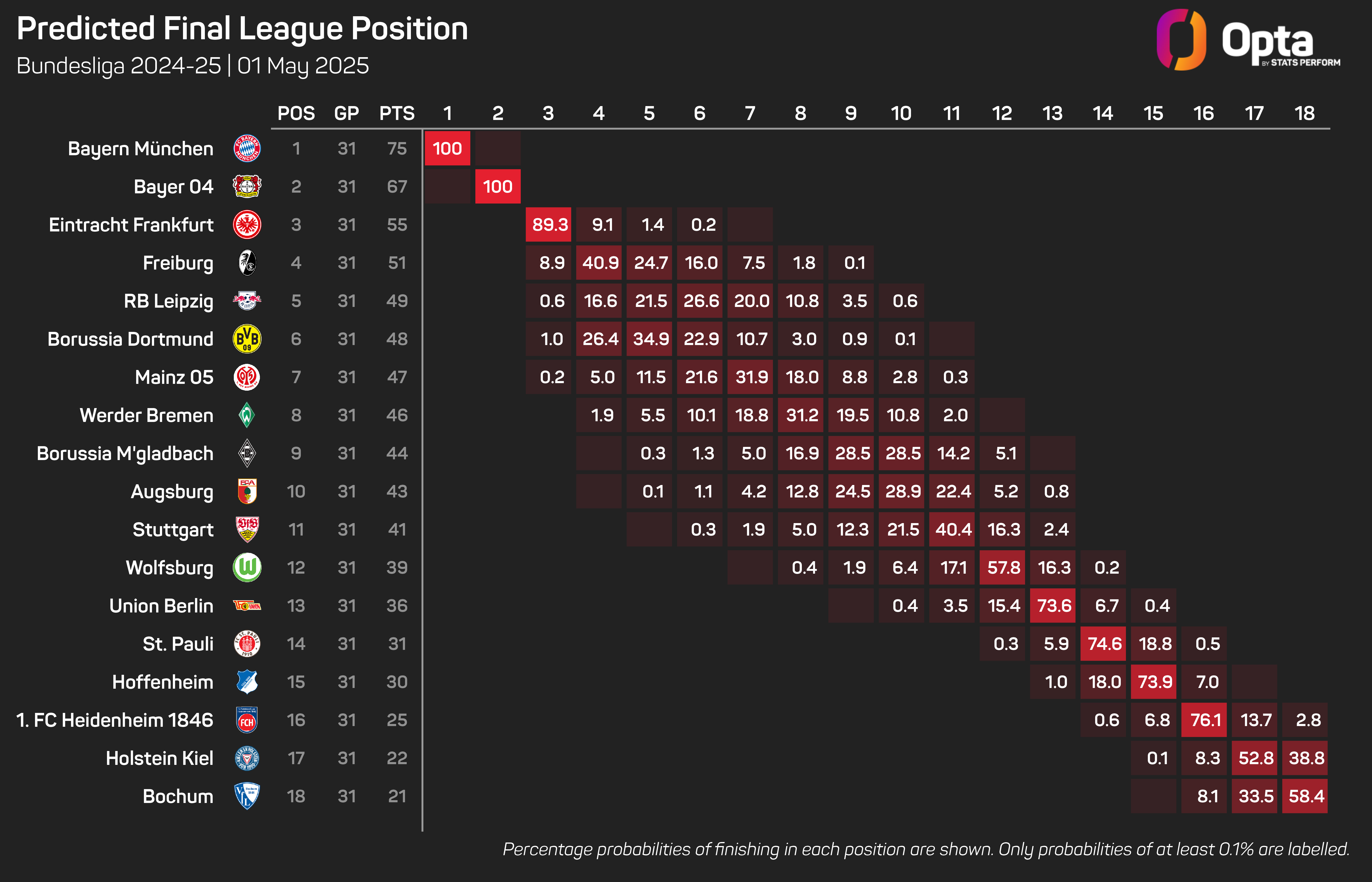 Freiburg are currently the favourites to round out the top four, according to the Opta supercomputer, at 40.9%.
