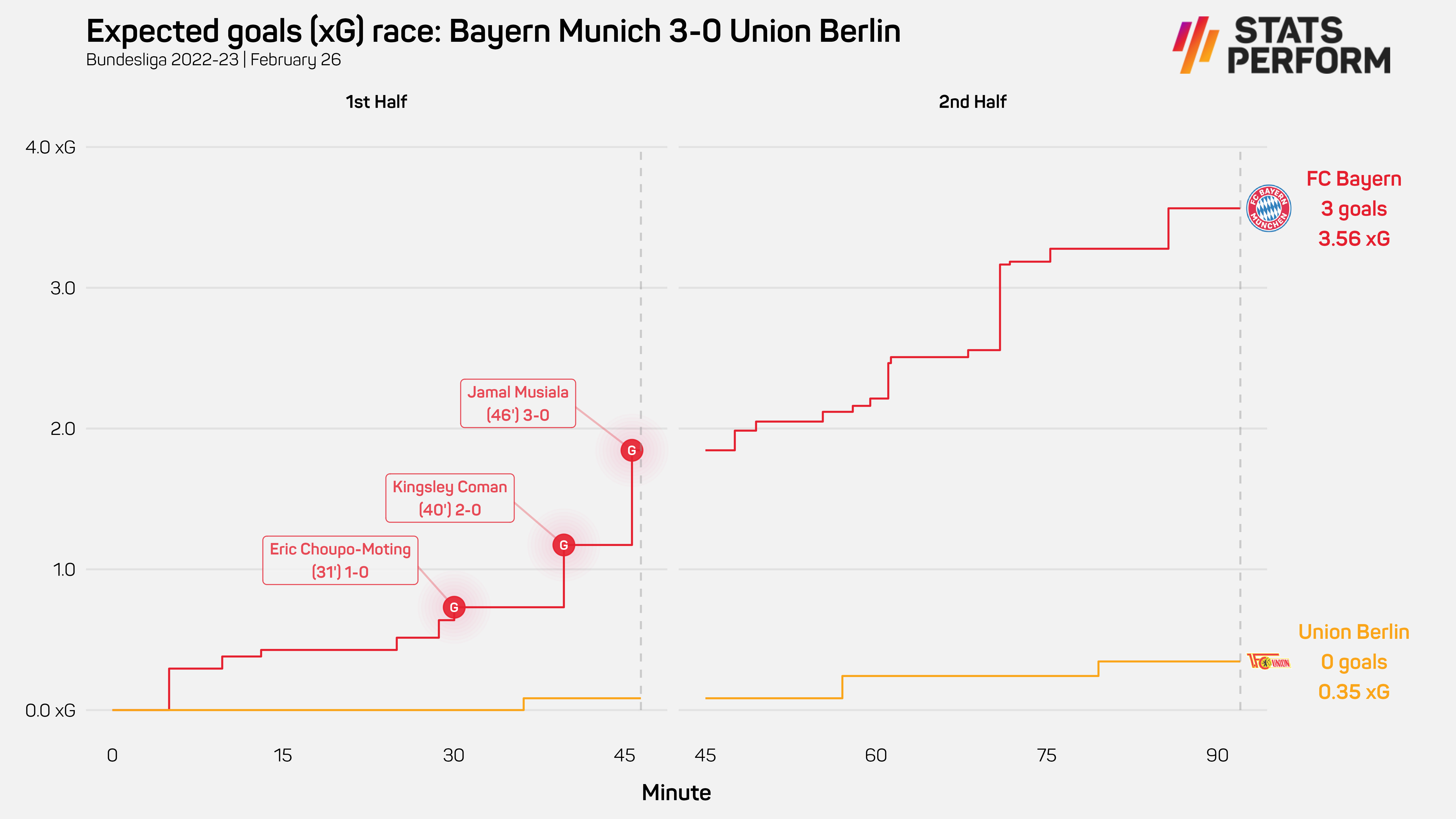 The expected goals comparison between the teams underlined Bayern's dominance, with Nagelsmann's team posting xG of 3.56 to Union's meagre 0.35, reflecting the quality and volume of the chances that came their way.