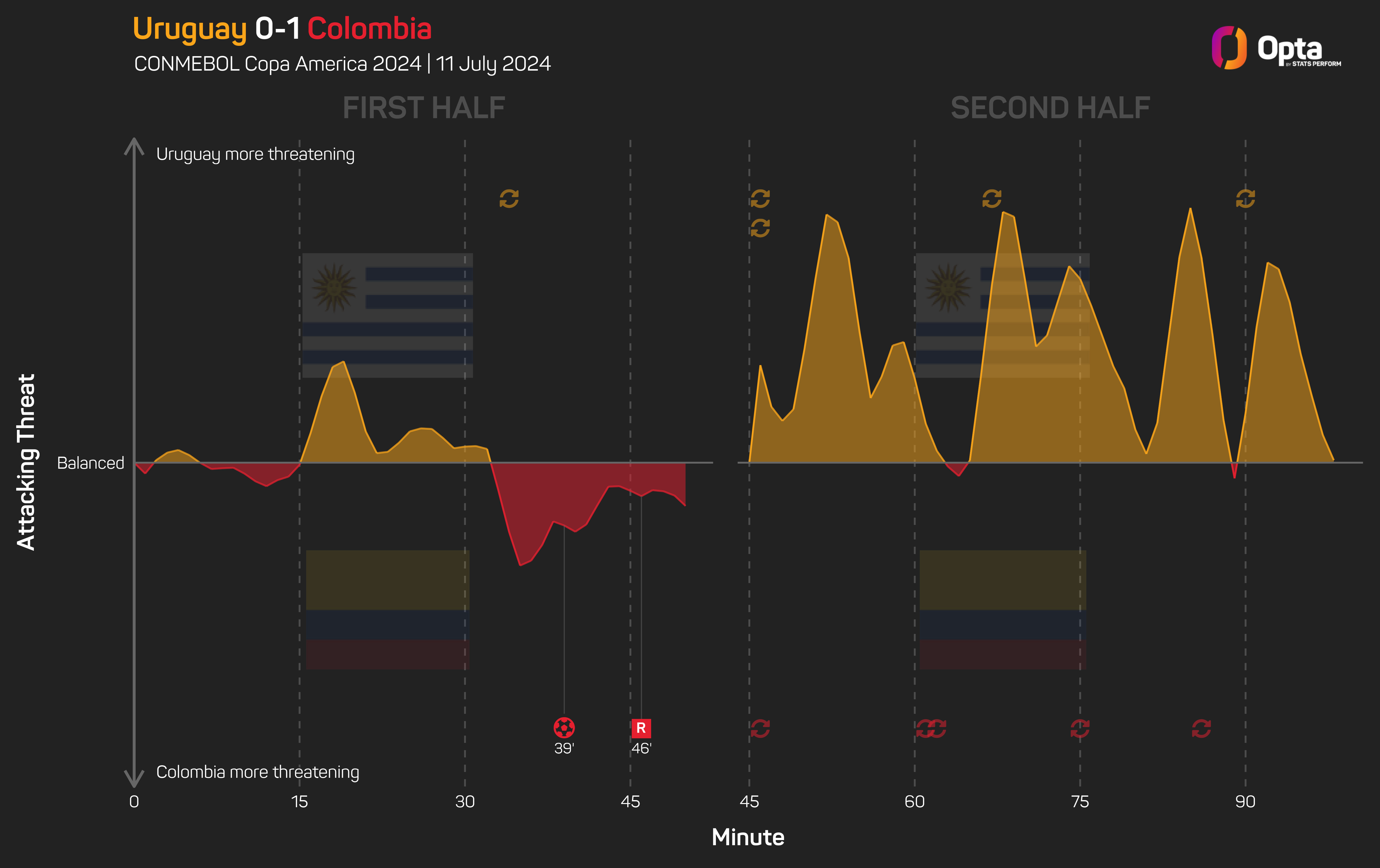 Uruguay had 73% of the possession after Colombia scored in the 39th minute, but Lorenzo's team managed seven shots to their opponents' six during that period.