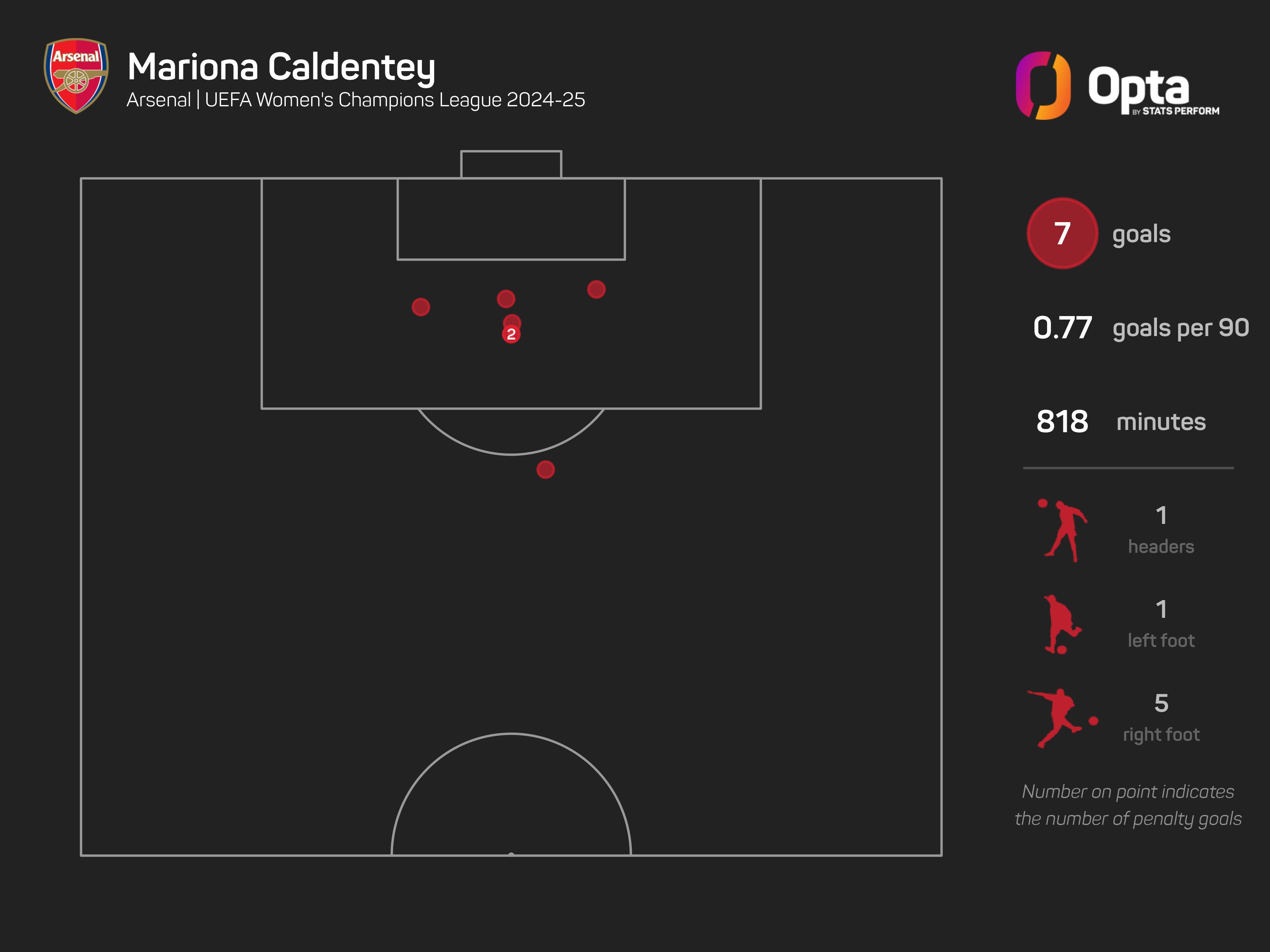 Caldentey has seven Champions League goals this season, with Barca striker Claudia Pina (10) the only player to outscore her.