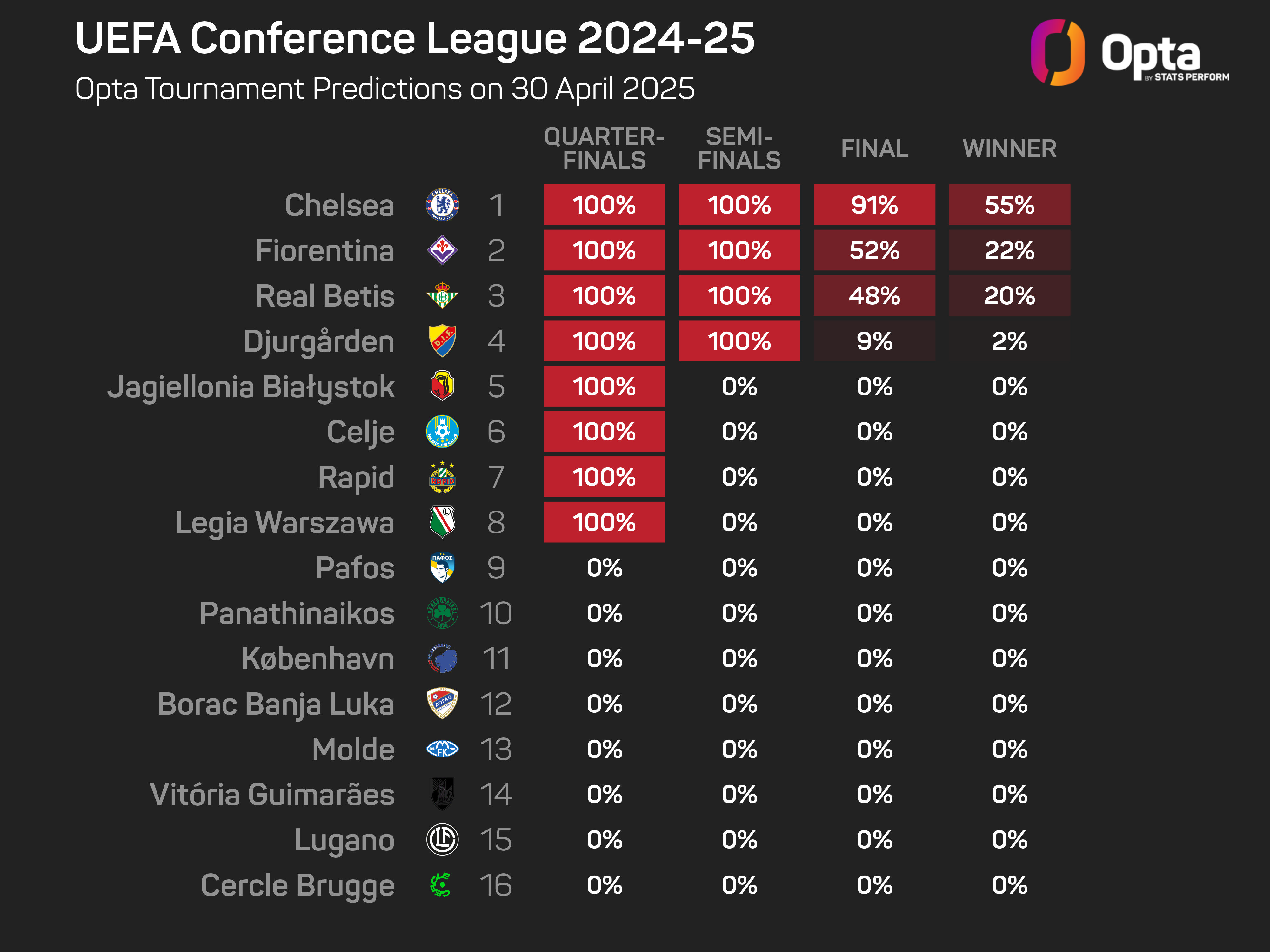 They have been given a 91% chance of progressing to the final, with their likely opponents being Fiorentina (52%), who face Real Betis (20%), in the other semi-final tie.