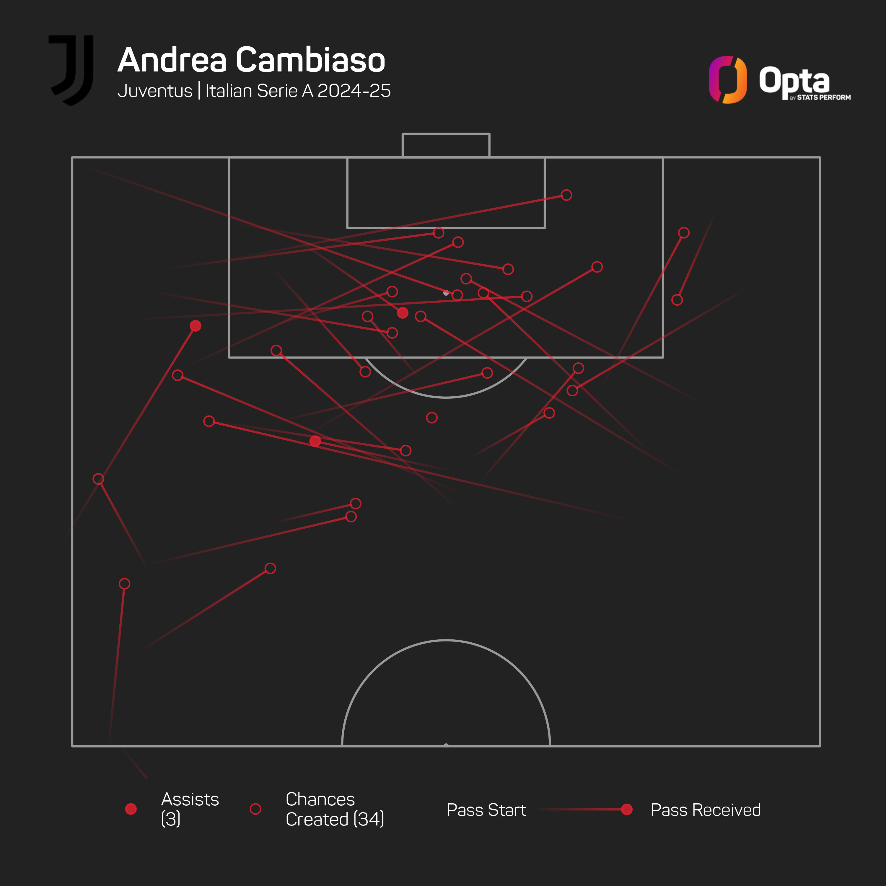 Only Manuel Locatelli (78) made more tackles than Cambiaso's 38 among Juve players last campaign, while only Khephren Thuram, Dusan Vlahovic (both five each) and Kenan Yildiz (six) provided more assists.