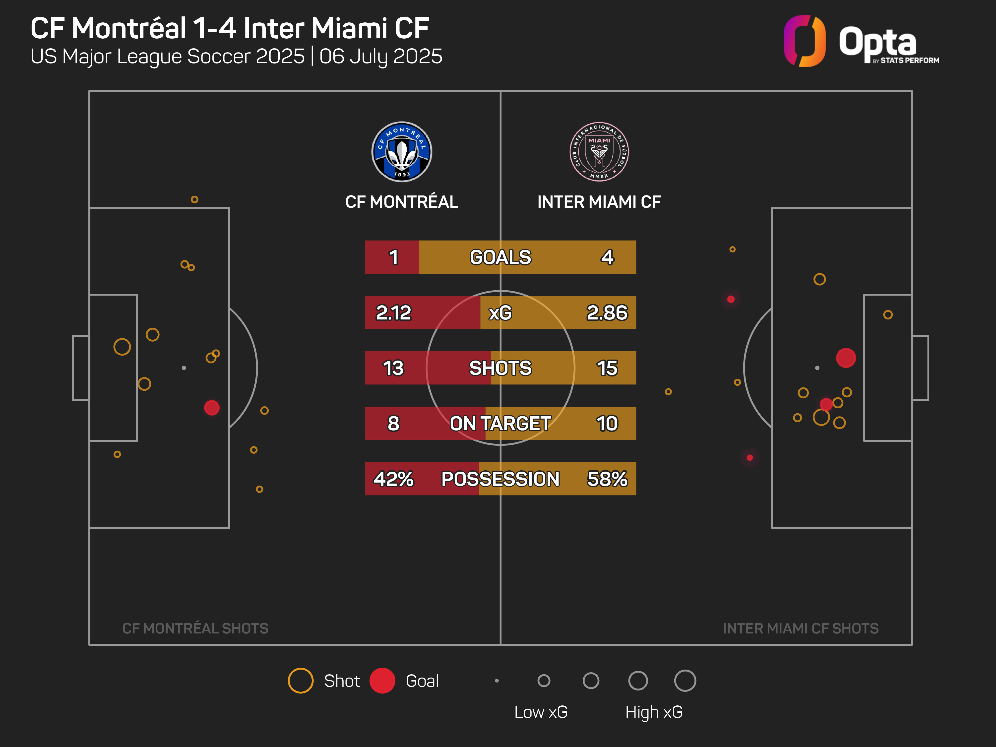 Miami, who sit sixth in the East, have now scored at least three goals in seven of their last nine league matches, after doing so once in their first eight MLS matches of 2025. They had 15 shots, getting a whopping 10 of those on target and registering 2.86 expected goals to Montreal's 2.12.