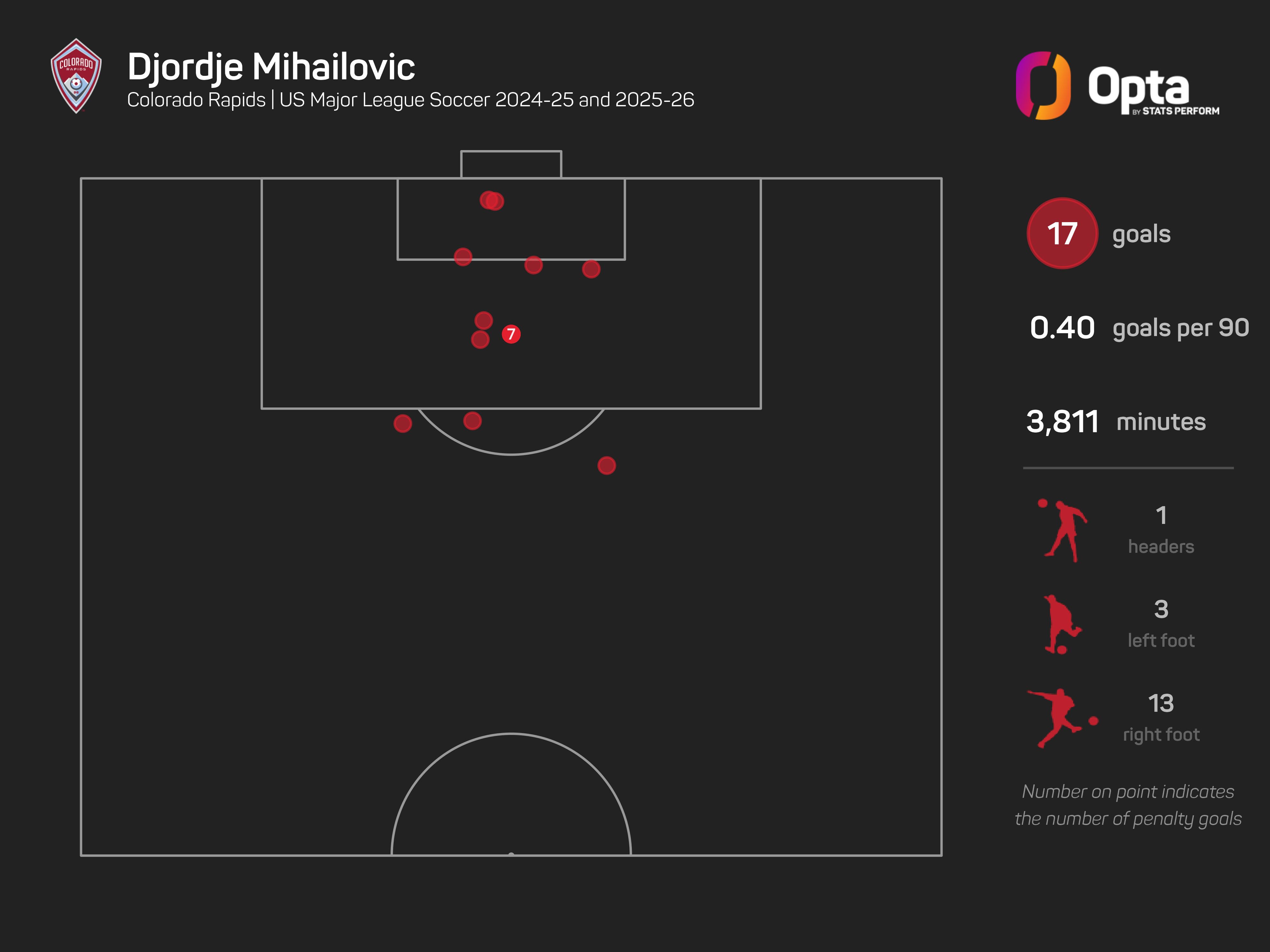 Mihailovic scored the only goal in Colorado's 1-0 win over Real Salt Lake on Saturday, his 32nd goal contribution since joining the Rapids last season (17 goals, 15 assists).