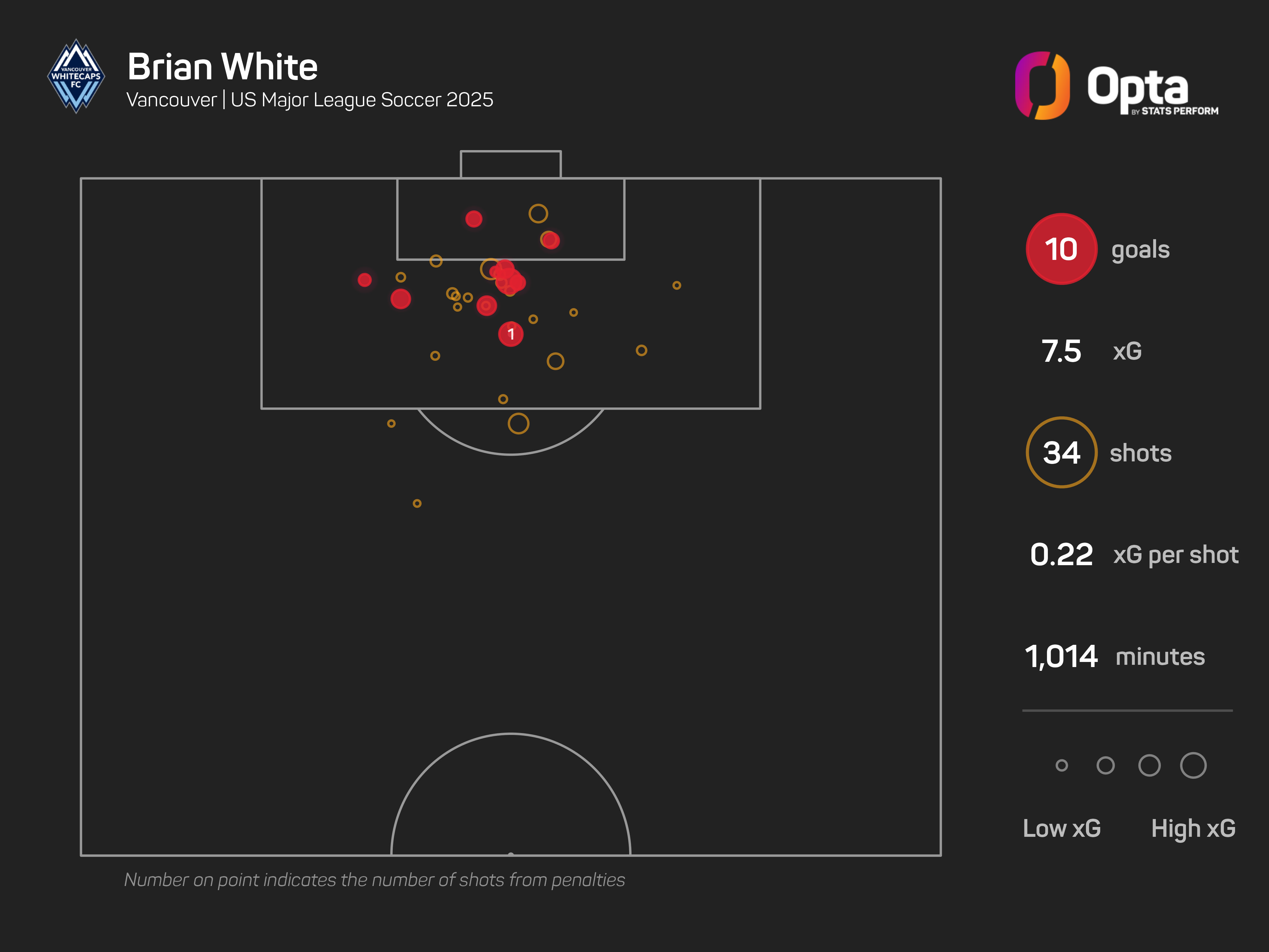 Brian White is a late bloomer, having scored his first goal for the USA at the age of 28 years and 354 days in January. Only Tai Baribo (13 goals) and Sam Surridge (11) have outscored the Vancouver Whitecaps frontman in MLS this year, with White's 10 goals coming from 7.5 expected goals (xG).
