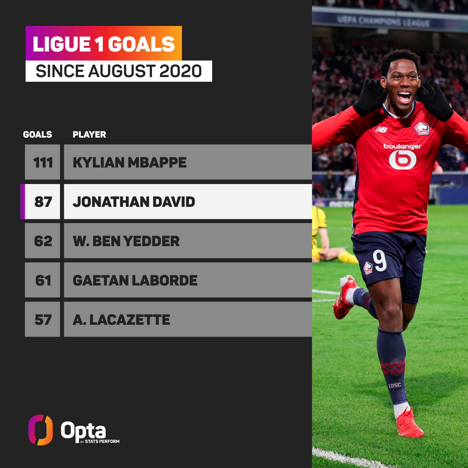 David – who averages more than a goal every other game for Canada (34 in 63 caps) – scored 87 goals in 178 Ligue 1 appearances for Lille. Since his debut in August 2020, only Mbappe has more goals in the French top-flight (111).
