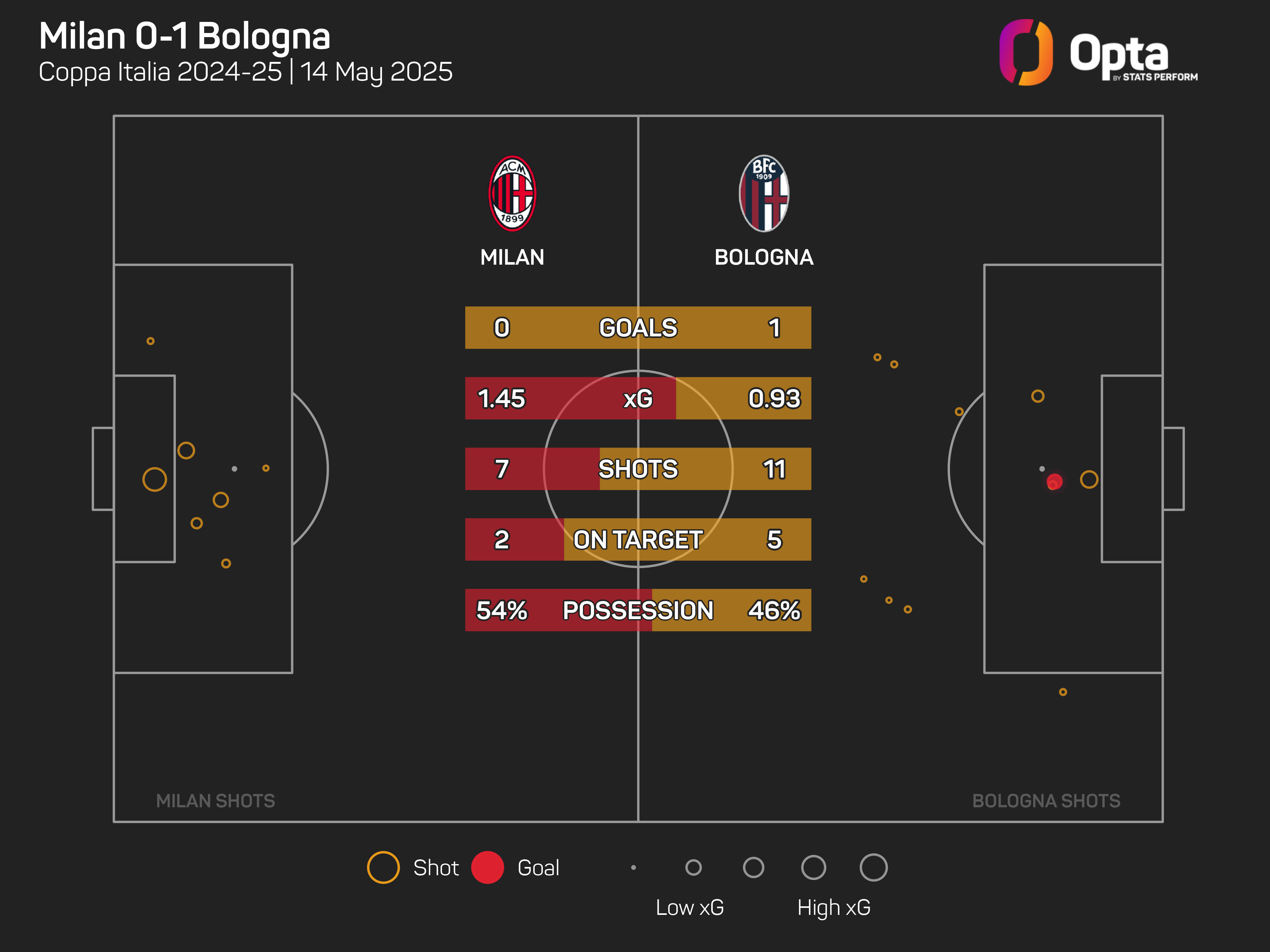 Milan had 10 attempts in Friday's win, with five on target, as they accumulated 1.7 expected goals (xG). On Wednesday, they had seven shots, testing Lukasz Skorupski just twice (1.5 xG).