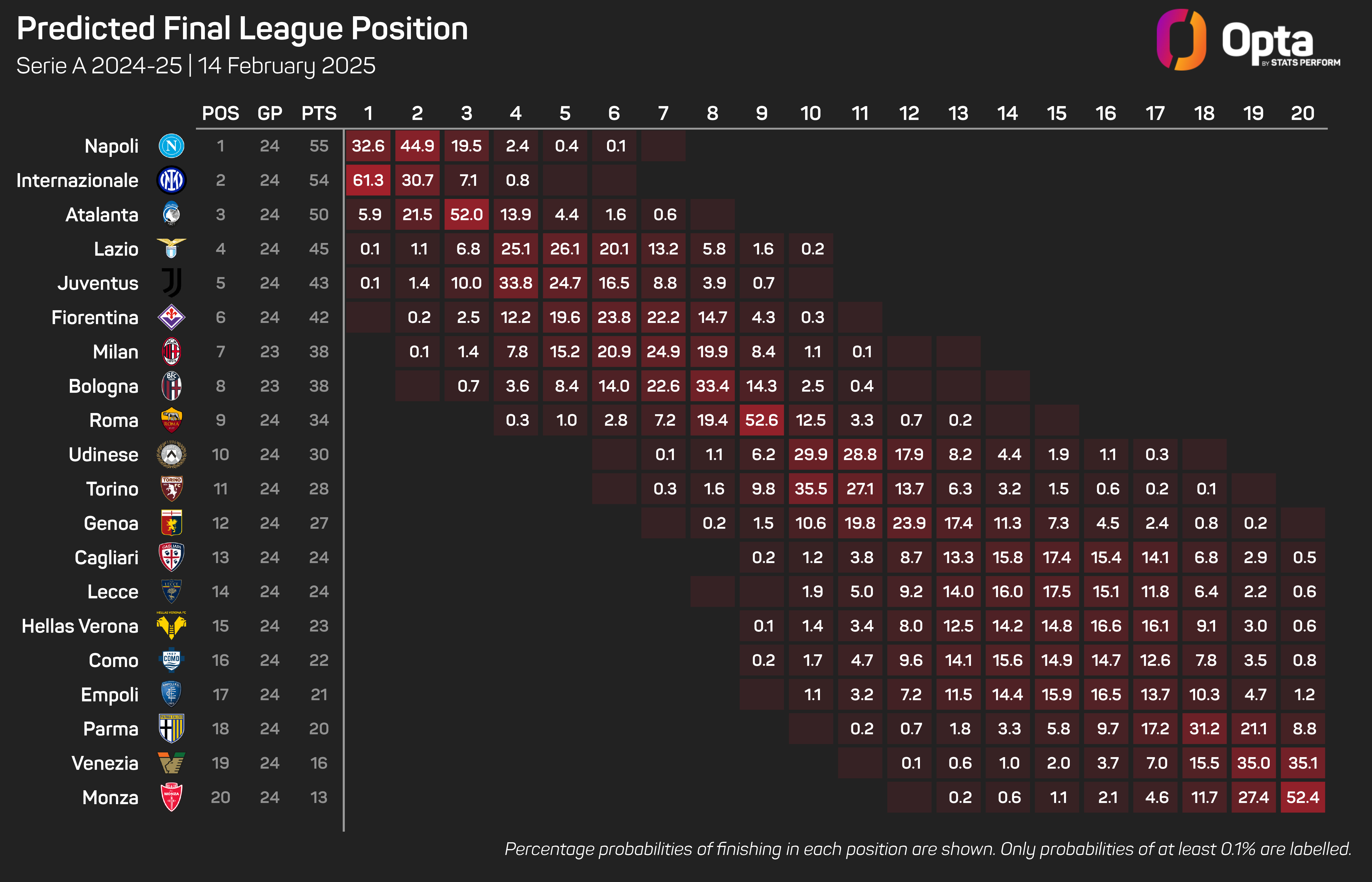 Despite that advantage, Napoli are only given a 32.6% chance of lifting the Serie A title this season by the Opta supercomputer, with Inter the current favourites at 61.3%.