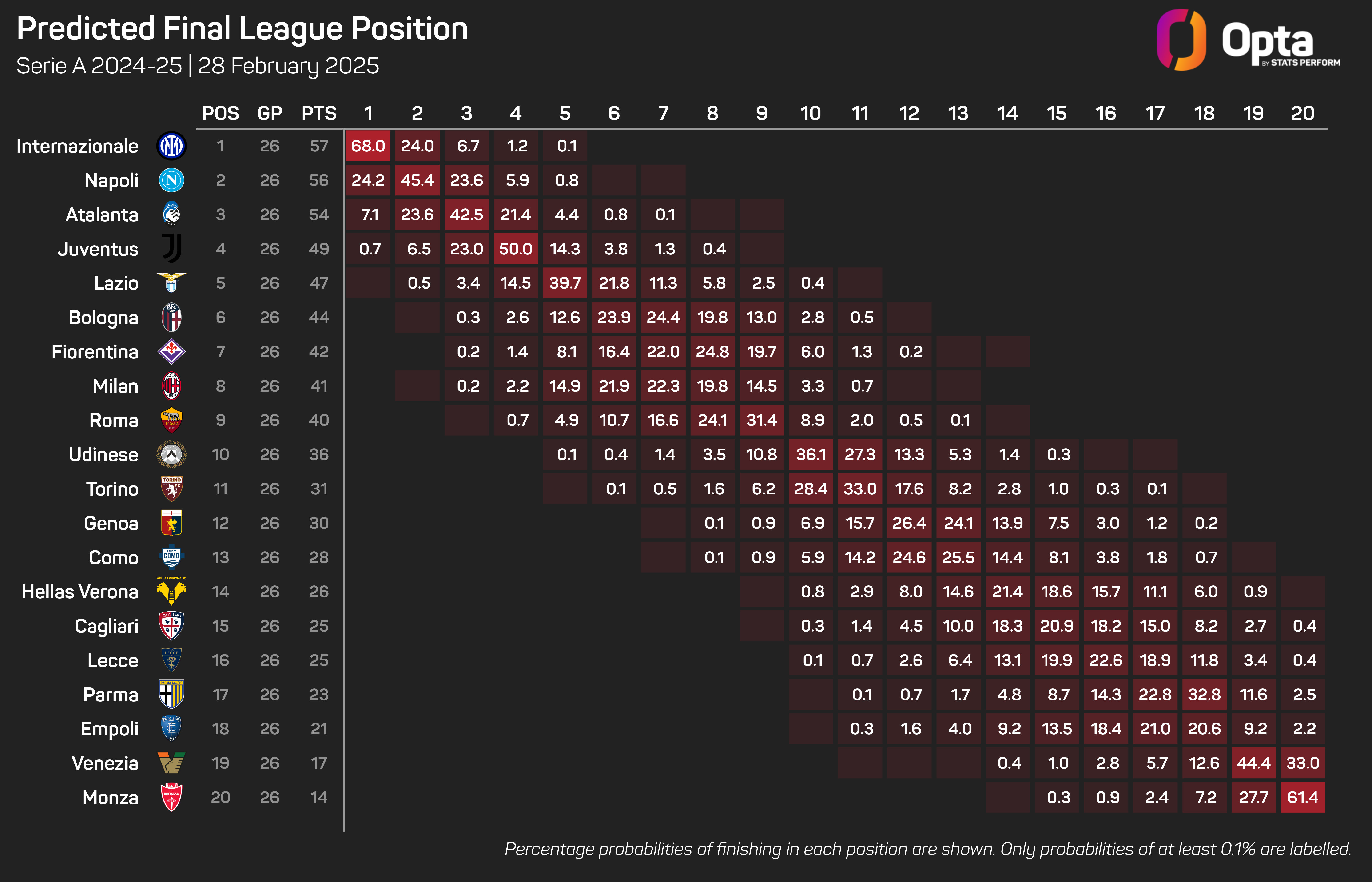 Napoli win the Scudetto in 24.2% of Opta's data-led simulations compared to Inter's 68%, while Atalanta are handed a 7.1% chance of finishing at the Serie A summit.
