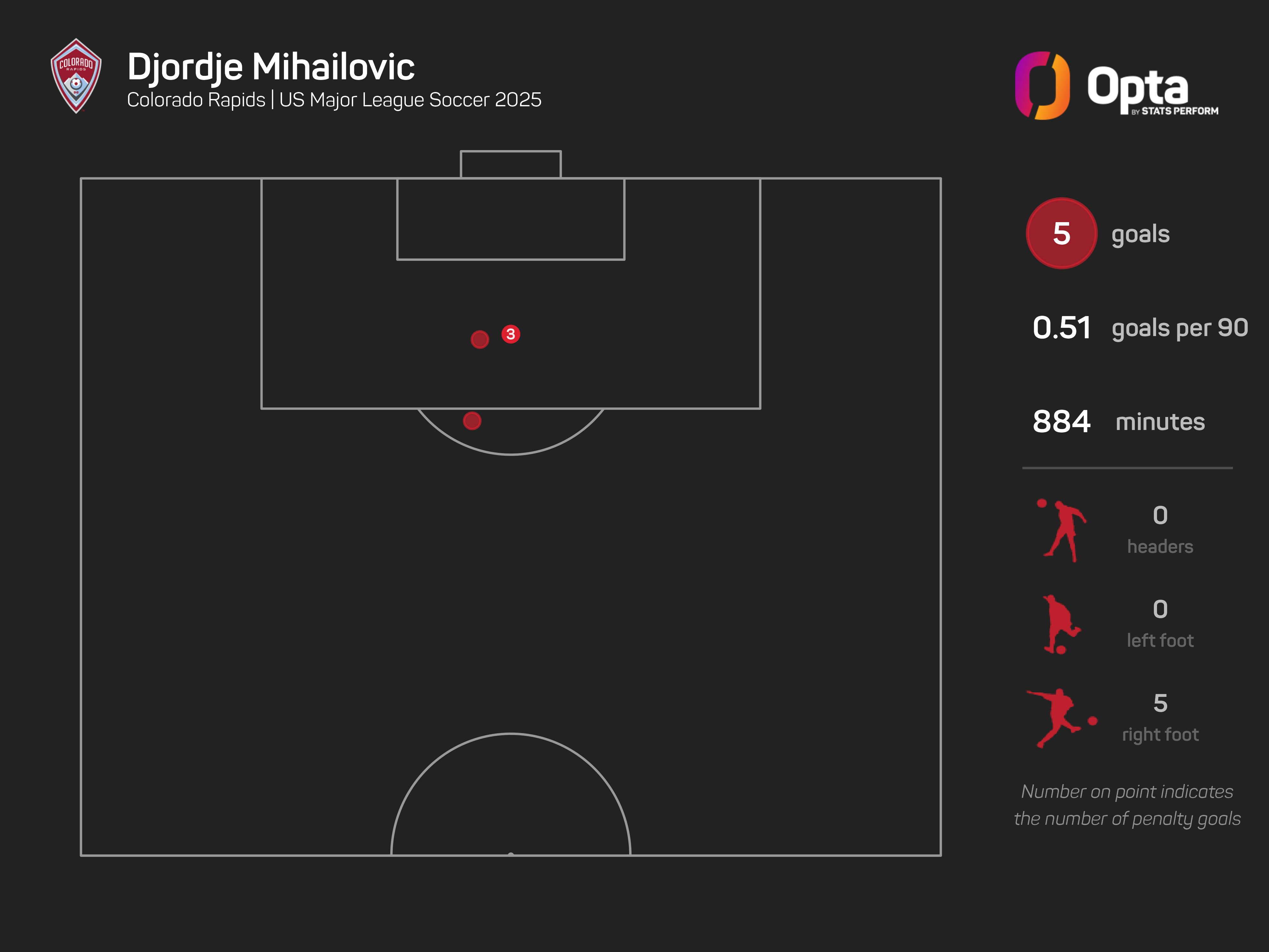 Including scoring the Rapids' lone goal on a direct free-kick on Saturday, Mihailovic has been directly involved in six of Colorado's last eight goals (five goals, one assist).