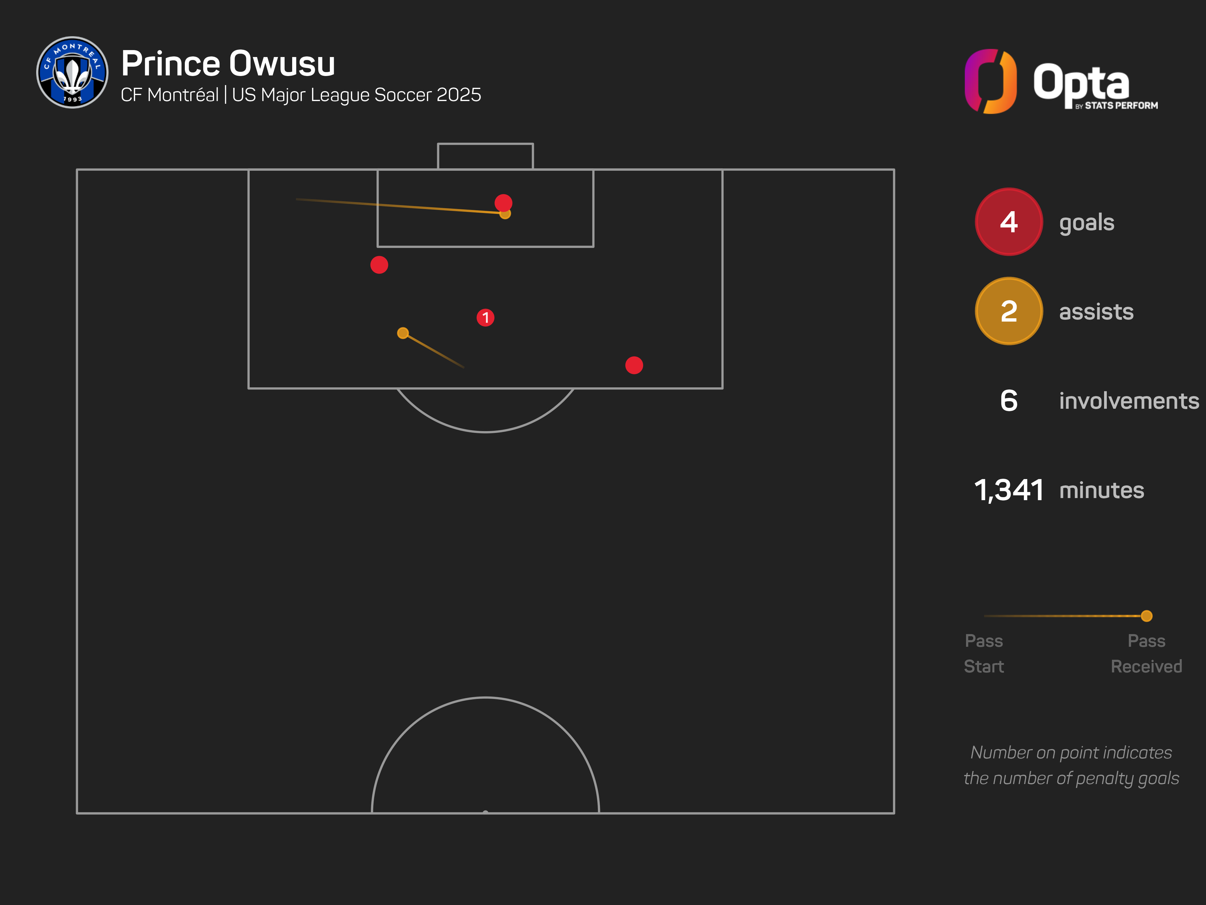 With joint-top scorer Vrioni suspended following his red card against New England, Owusu looks to be the man to lead the line for Montreal.