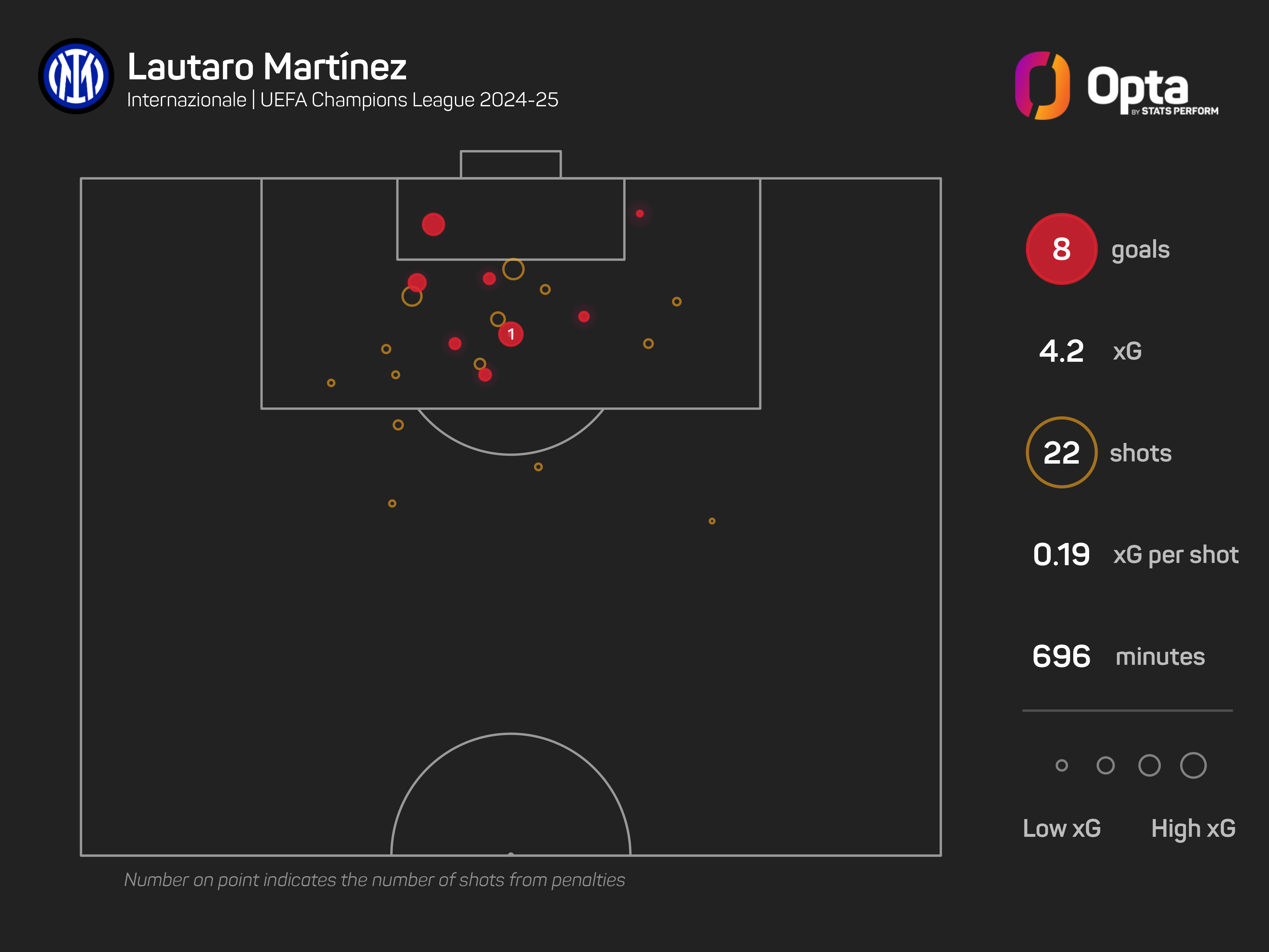 Martinez has eight Champions League goals for Inter this season, with that team-high figure coming from chances worth just 4.2 expected goals (xG).