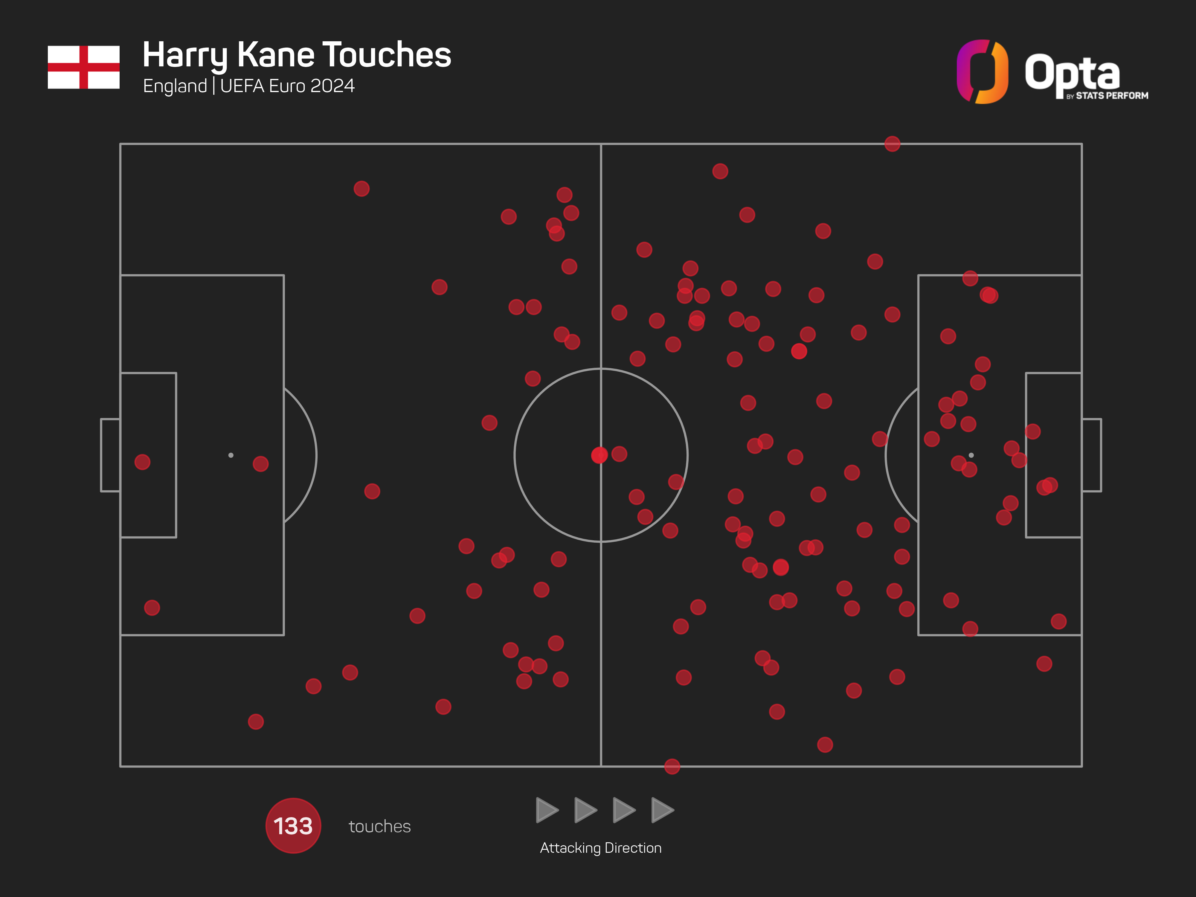 Kane had five touches in Switzerland's box before Saturday's penalty shoot-out win in Dusseldorf, a tally bettered by Bukayo Saka (eight) and Jude Bellingham (10).