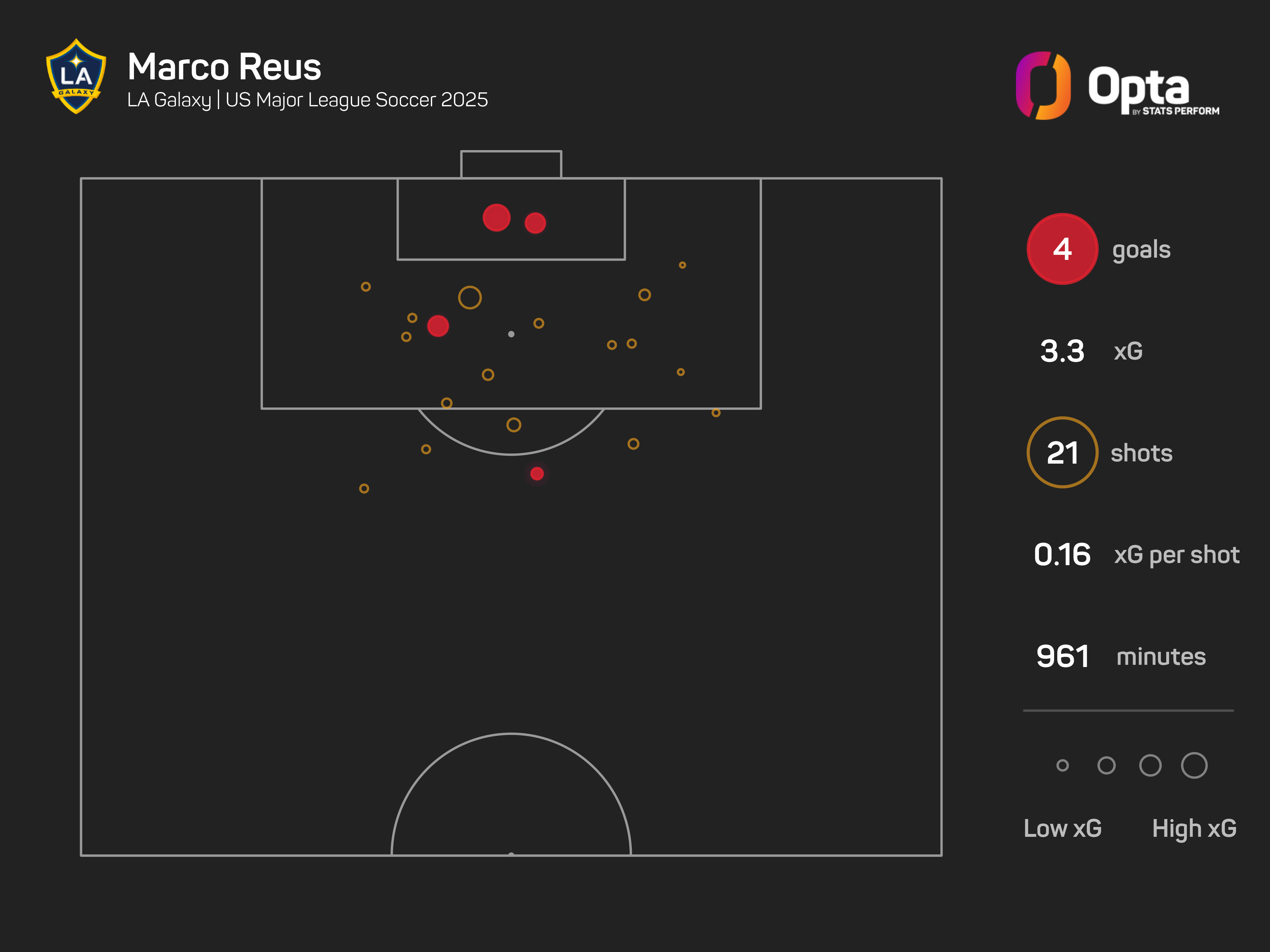 Reus notched a goal and registered two shots on target in the Galaxy's draw with the Earthquakes, registering his third goal contribution in as many games (also two assists).