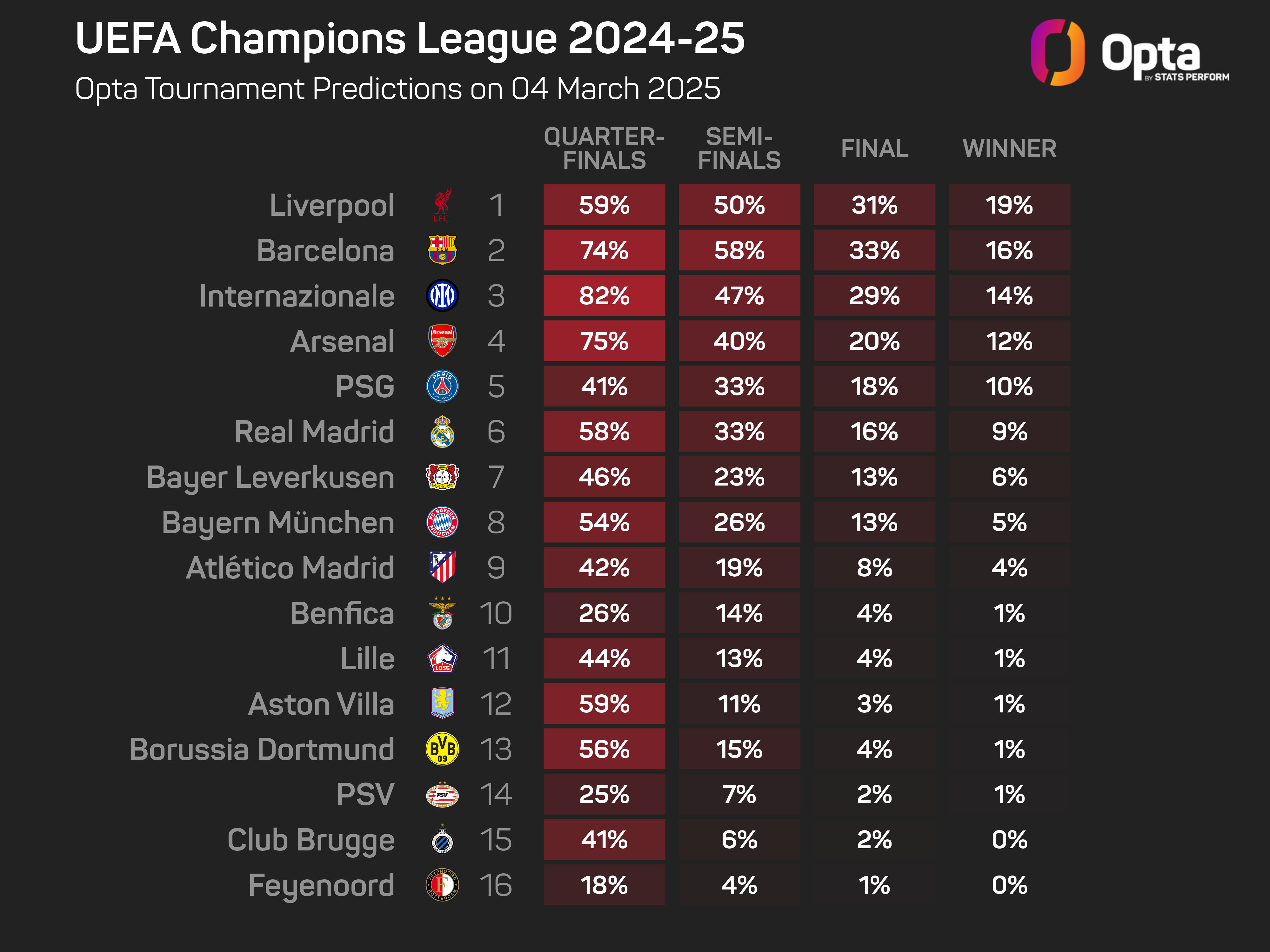 But in Liverpool, they will face the Opta supercomputer's current favourites to lift the Champions League trophy – the Merseyside club are assigned a 19% chance of becoming European champions for a seventh time, with PSG assigned a 10% probability.