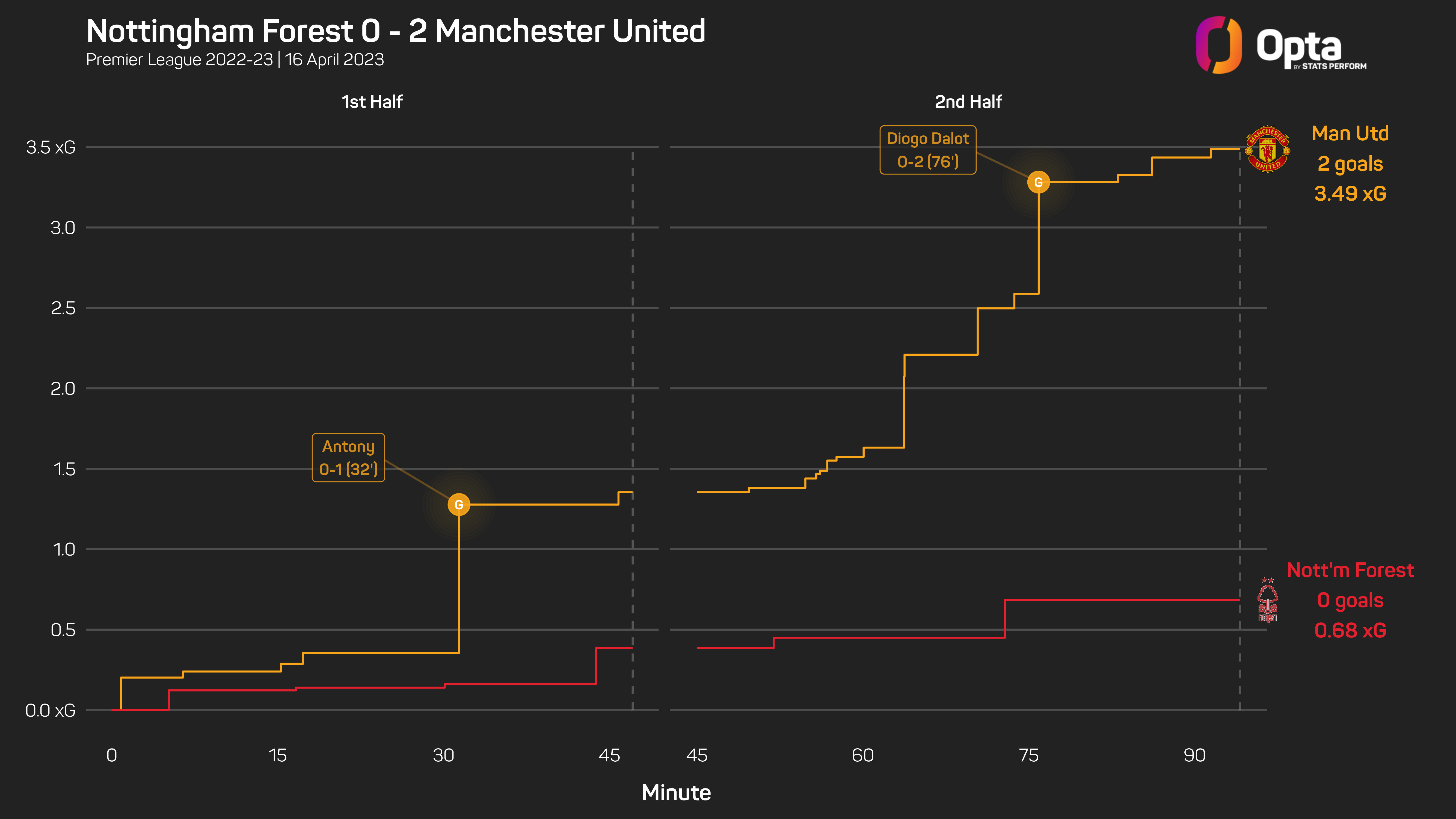United ended the game with an expected goals rate (xG) of 3.49, and ultimately secured three points to leapfrog Newcastle United into third place in the Premier League.