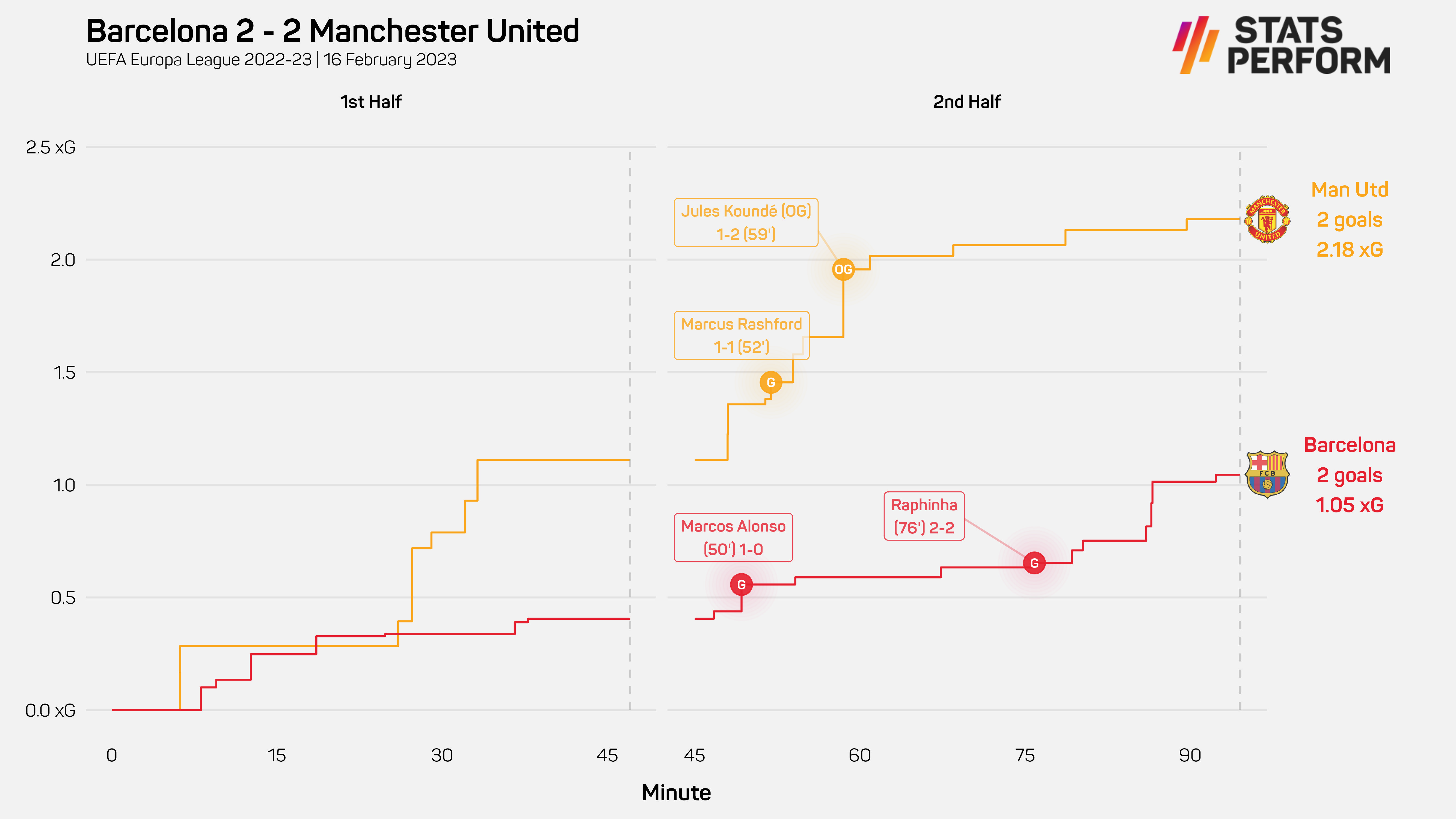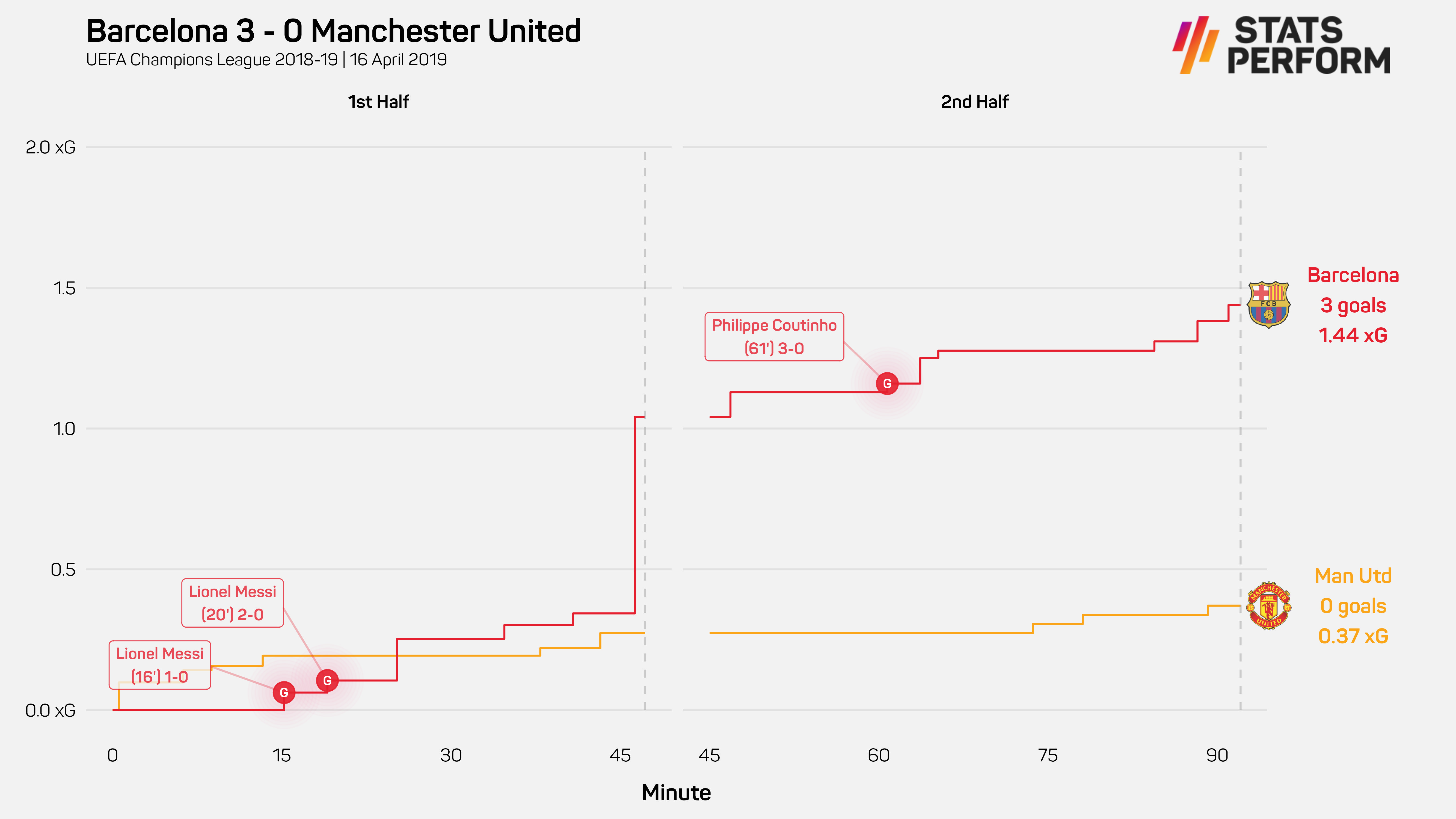Their shots were worth 2.2 expected goals (xG) to Barca's 1.1. In the time that this data is available (since 2013-14), United have only recorded more xG in European knockout games away from Old Trafford seven times.