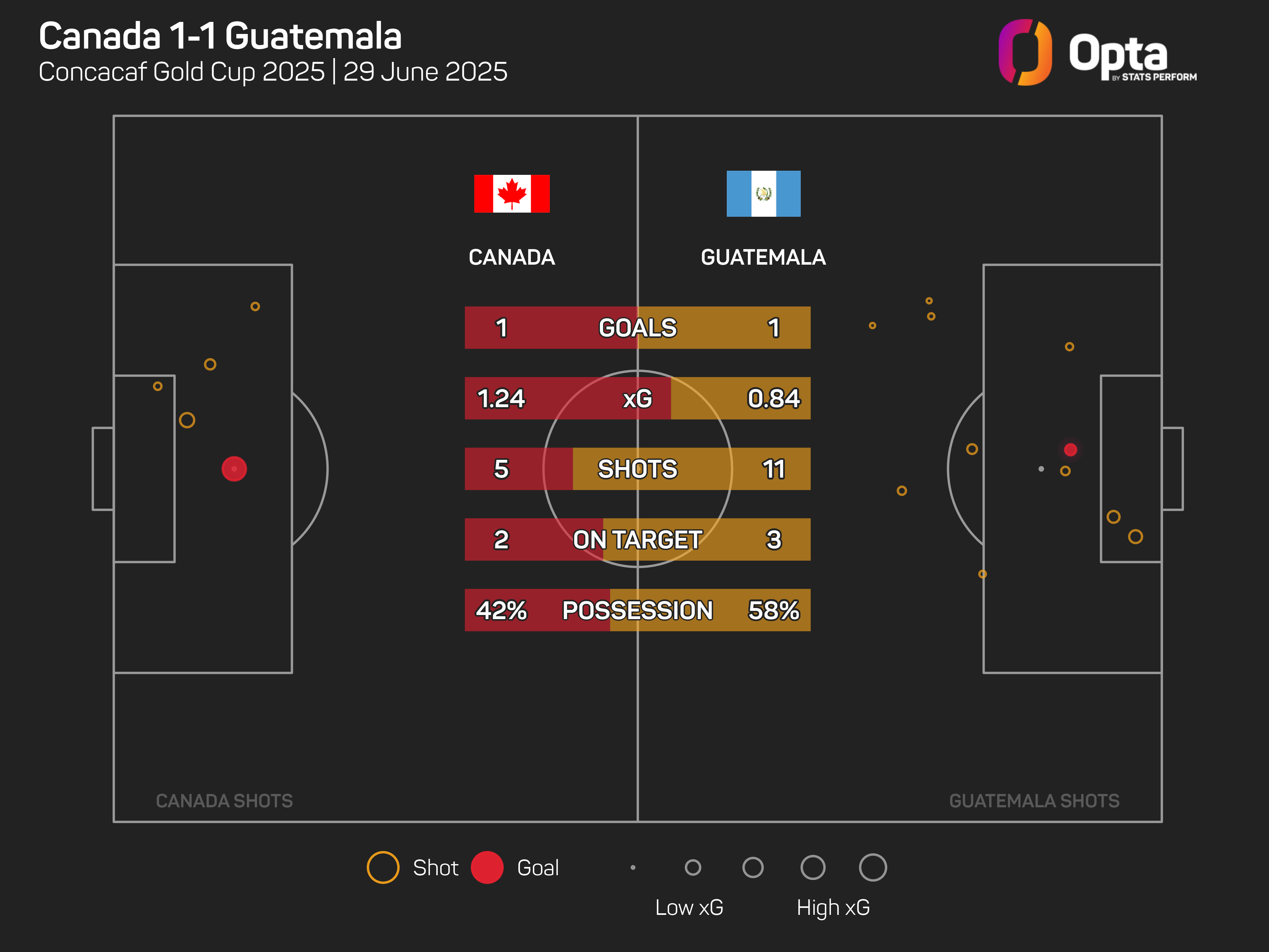 Canada were limited to just five shots overall, and two on target, though the majority of those came in the first half when they had 11 players on the pitch.