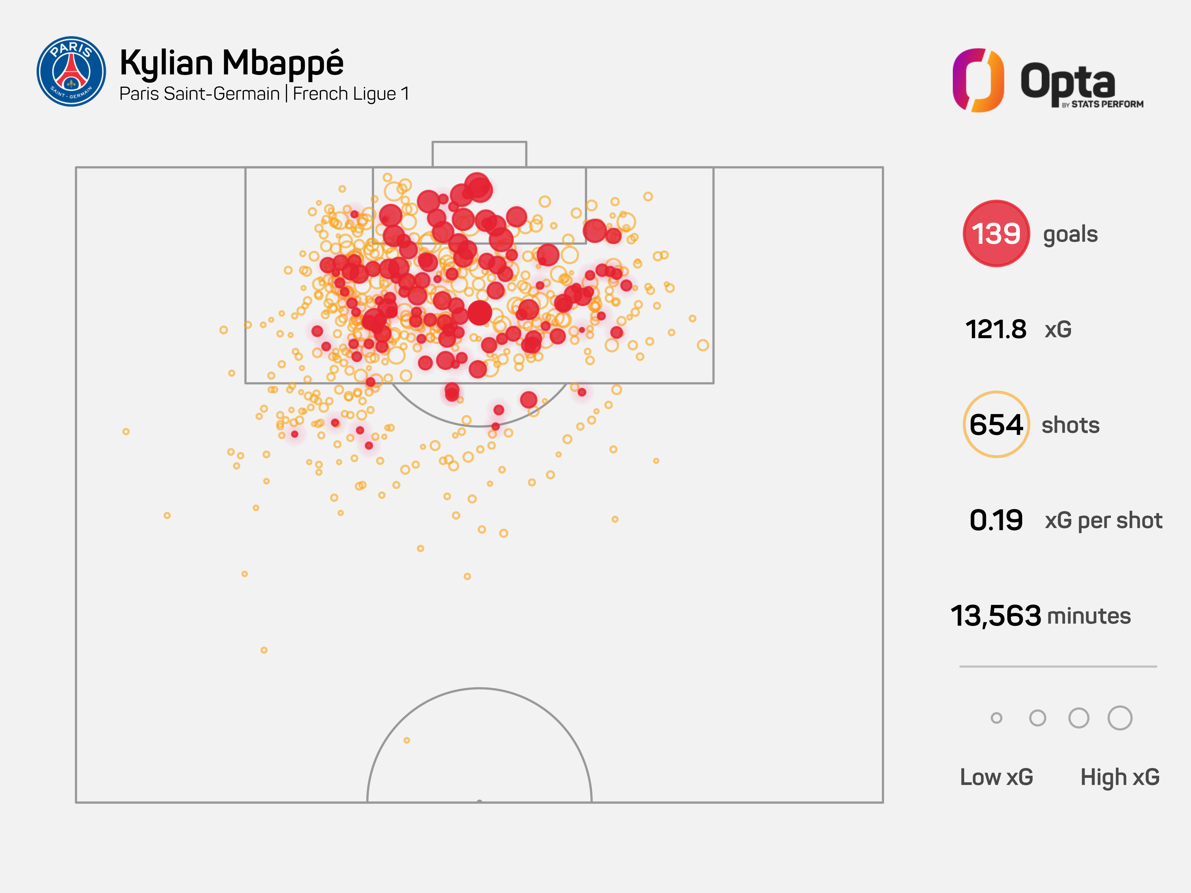 While Cavani's 138 goals almost exactly matched his 137.8 expected goals, Mbappe has outperformed his xG in all seasons but his first at the club.