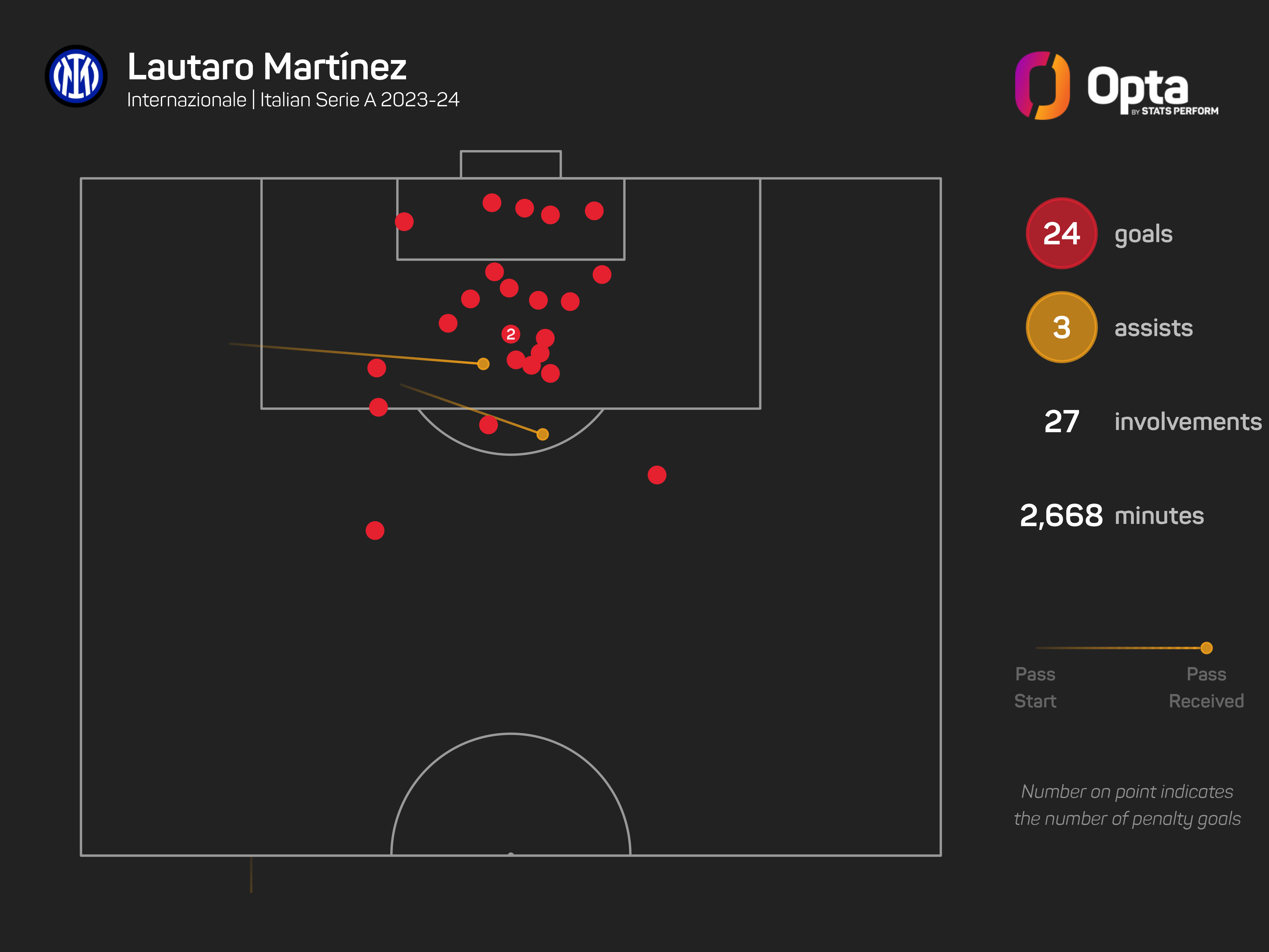 Martinez has had an outstanding season for Inter, who he led to the Scudetto while finishing as top scorer in Serie A, scoring 24 goals in 33 appearances, and comfortably outperforming his 17.6 xG.
