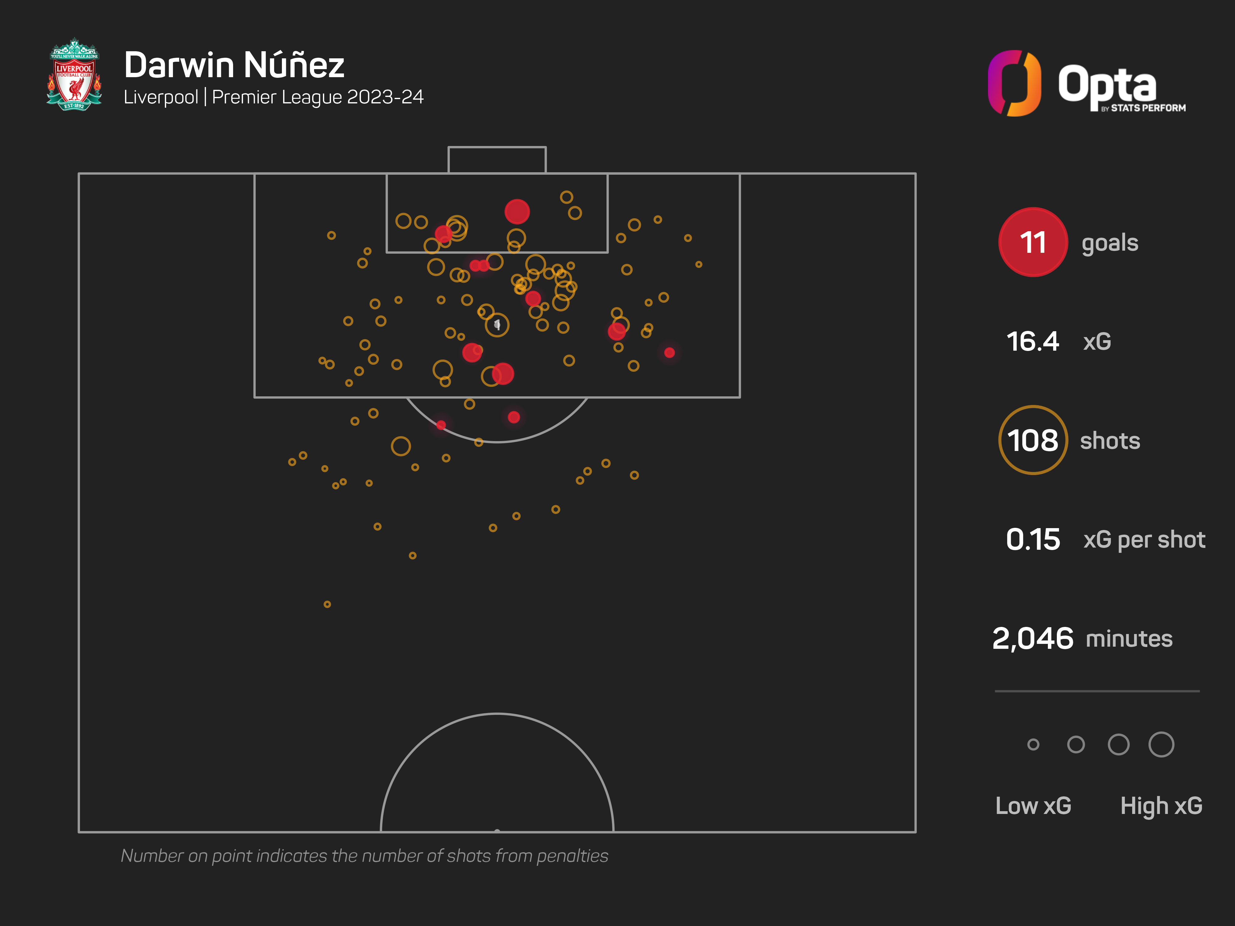 Nunez scored 11 Premier League goals for the Reds in 2023-24, but underperformed his xG (16.4) by 5.4. While he was unfortunate in a sense – he hit the woodwork on nine occasions, four more times than any other player – he was also erratic in his finishing, with his xGoT dropping to 15.5. Nunez also missed 14 big chances, which ranked behind only Manchester City’s Erling Haaland (34).