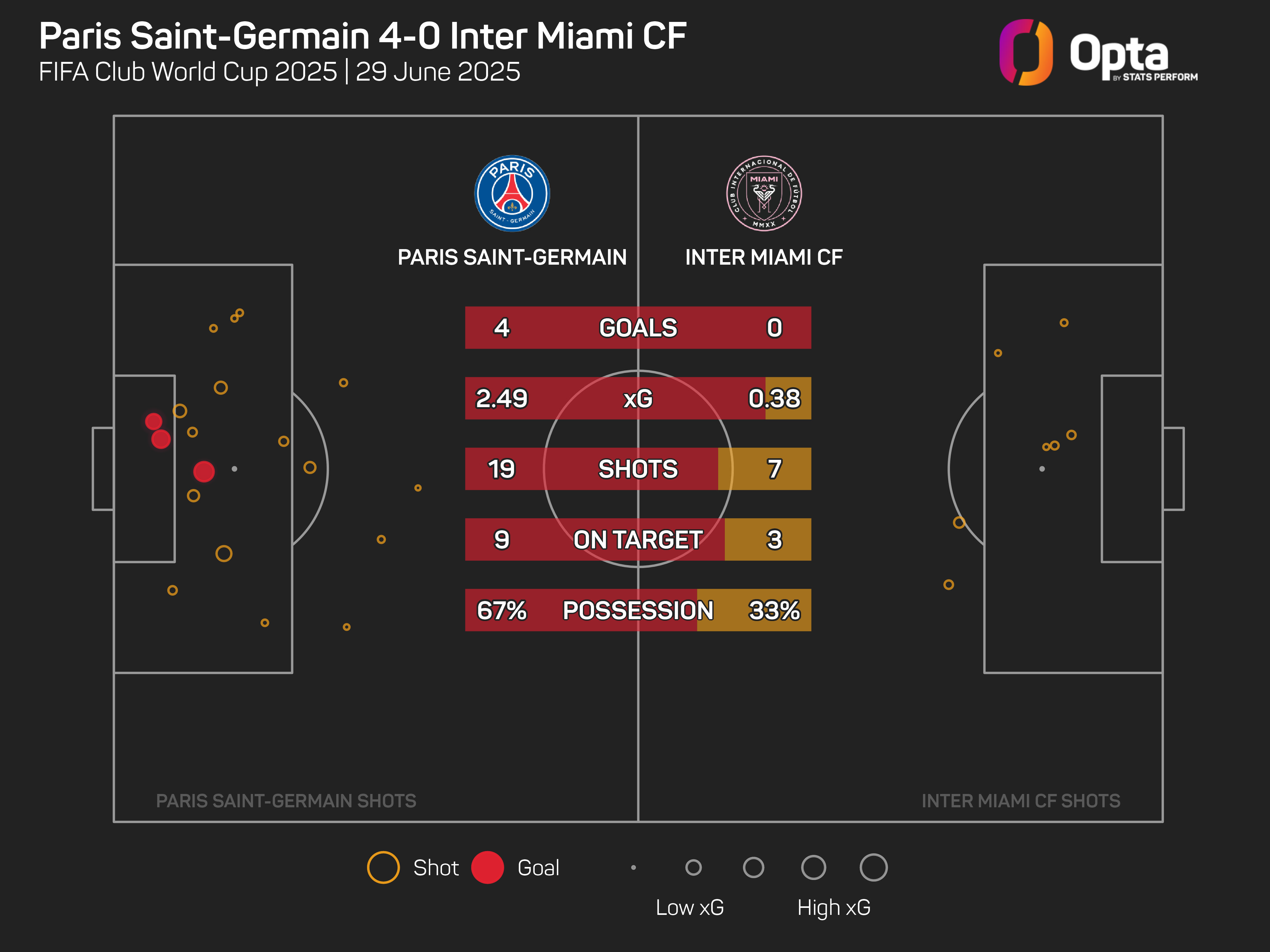 PSG dominated the opening period, having 10 attempts, while Miami failed to muster a shot on goal. The Herons marginally improved after the break, with eight efforts, three of which were on target.