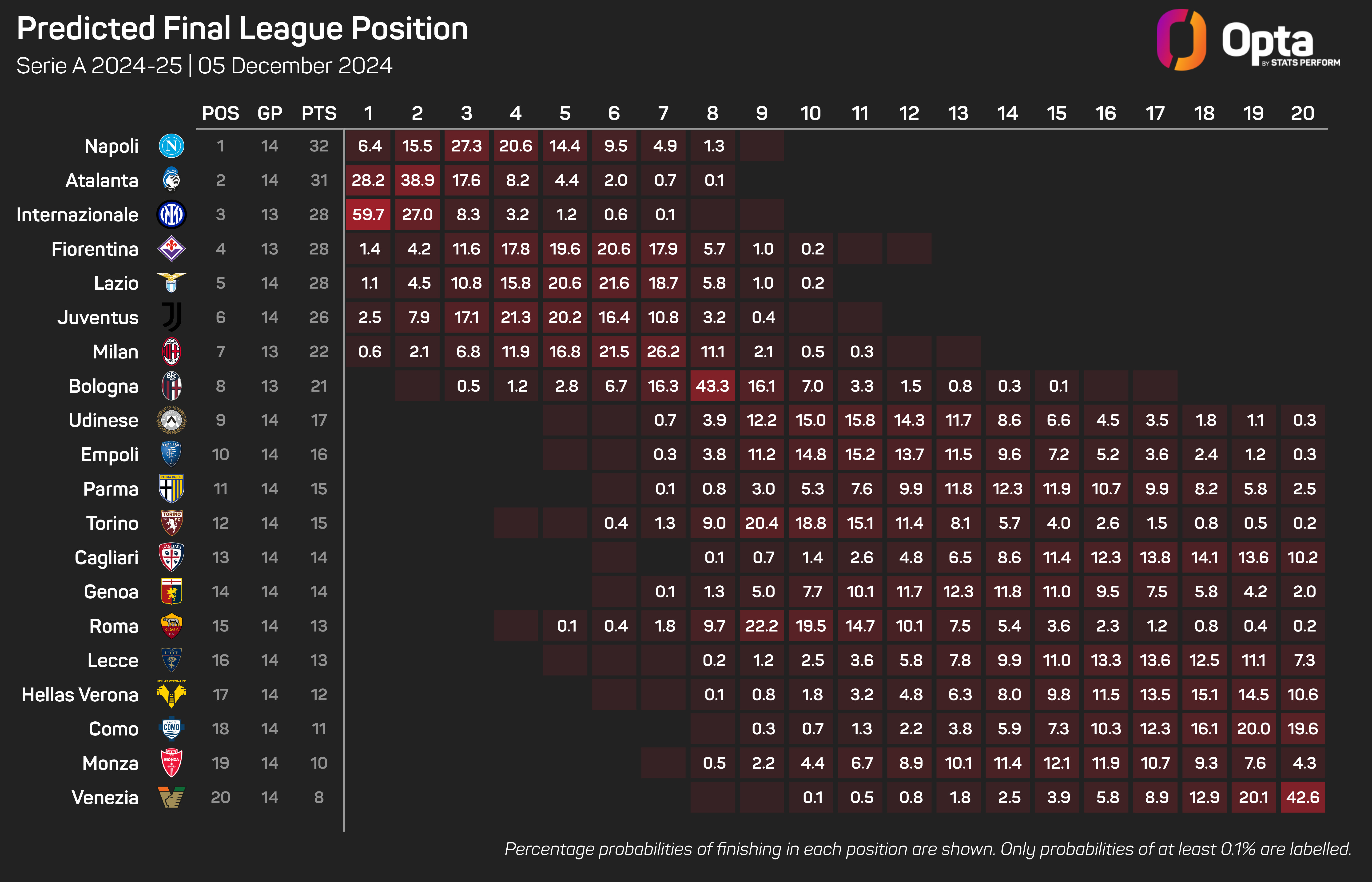 Atalanta are unbeaten in the league since a 3-2 defeat to Como in late September, and are second behind Napoli. They have earned more than 30 points after 14 games played in Serie A for the first time in their history.