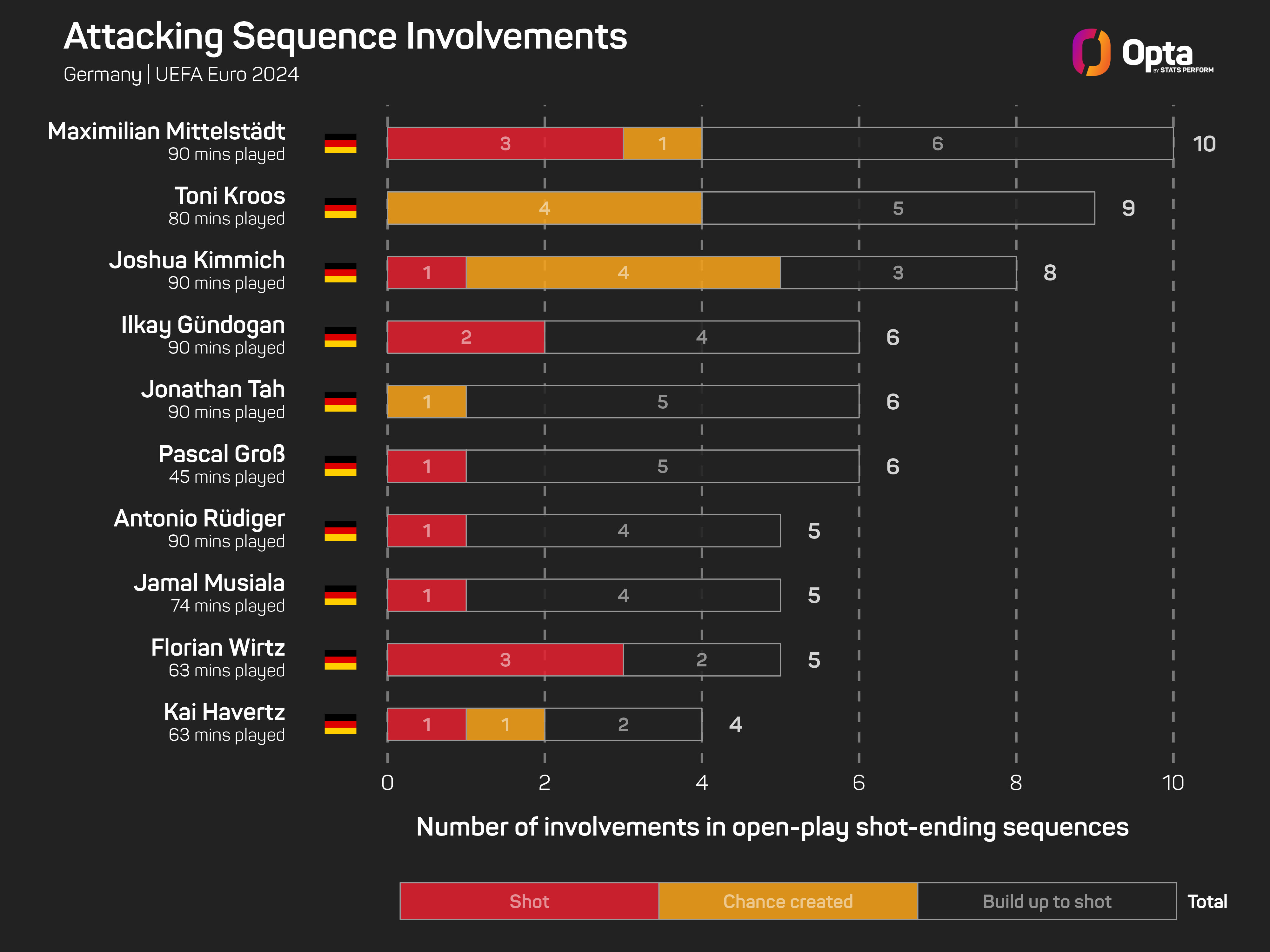 Germany recorded the biggest opening-game win at a European Championship, with Florian Wirtz, Jamal Musiala, Kai Havertz, Niclas Fullkrug and Emre Can scoring.