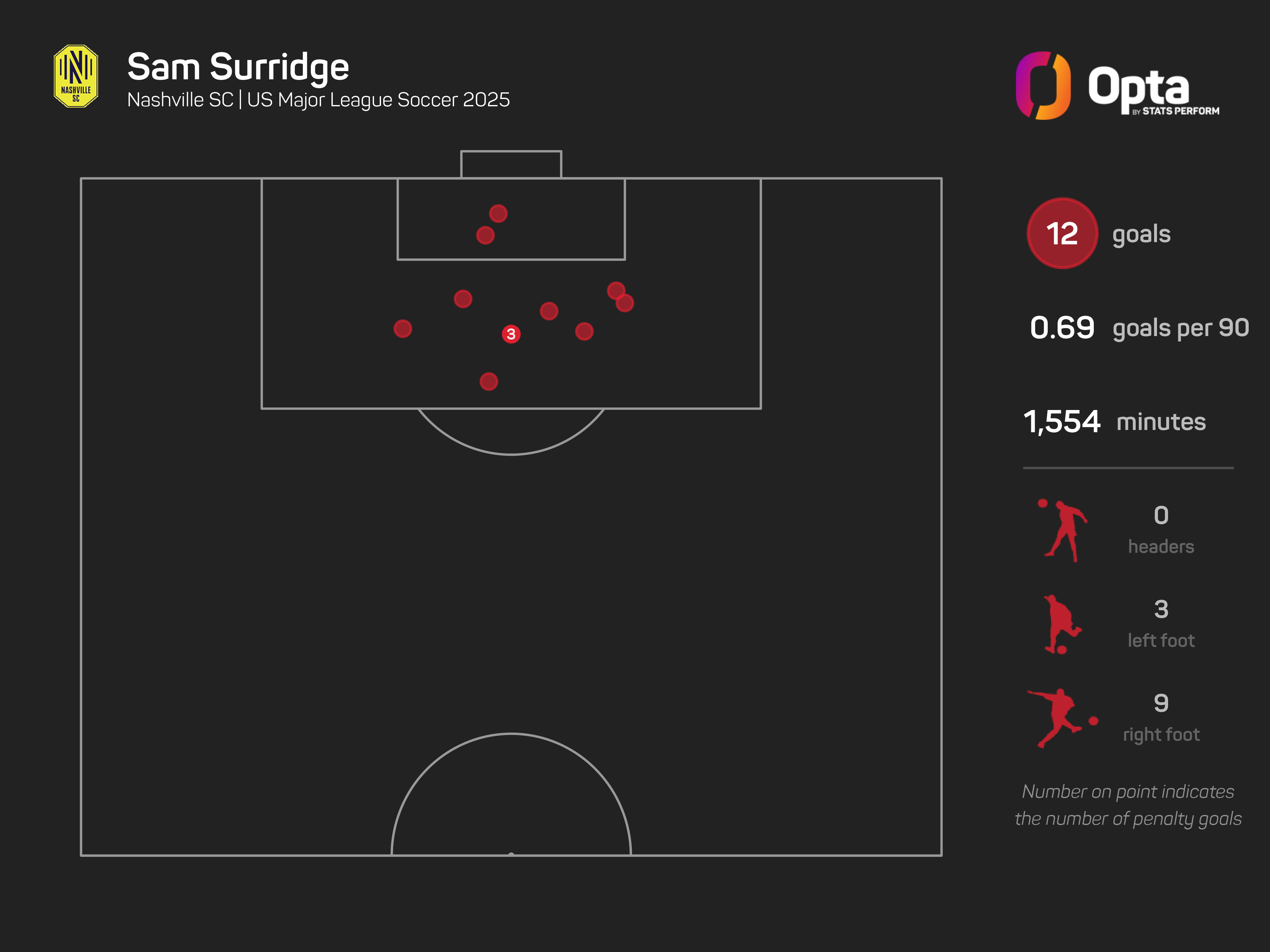 Surridge is Nashville's top scorer this season with 12 goals in 18 MLS appearances, six of which have come in his last four games in the competition.