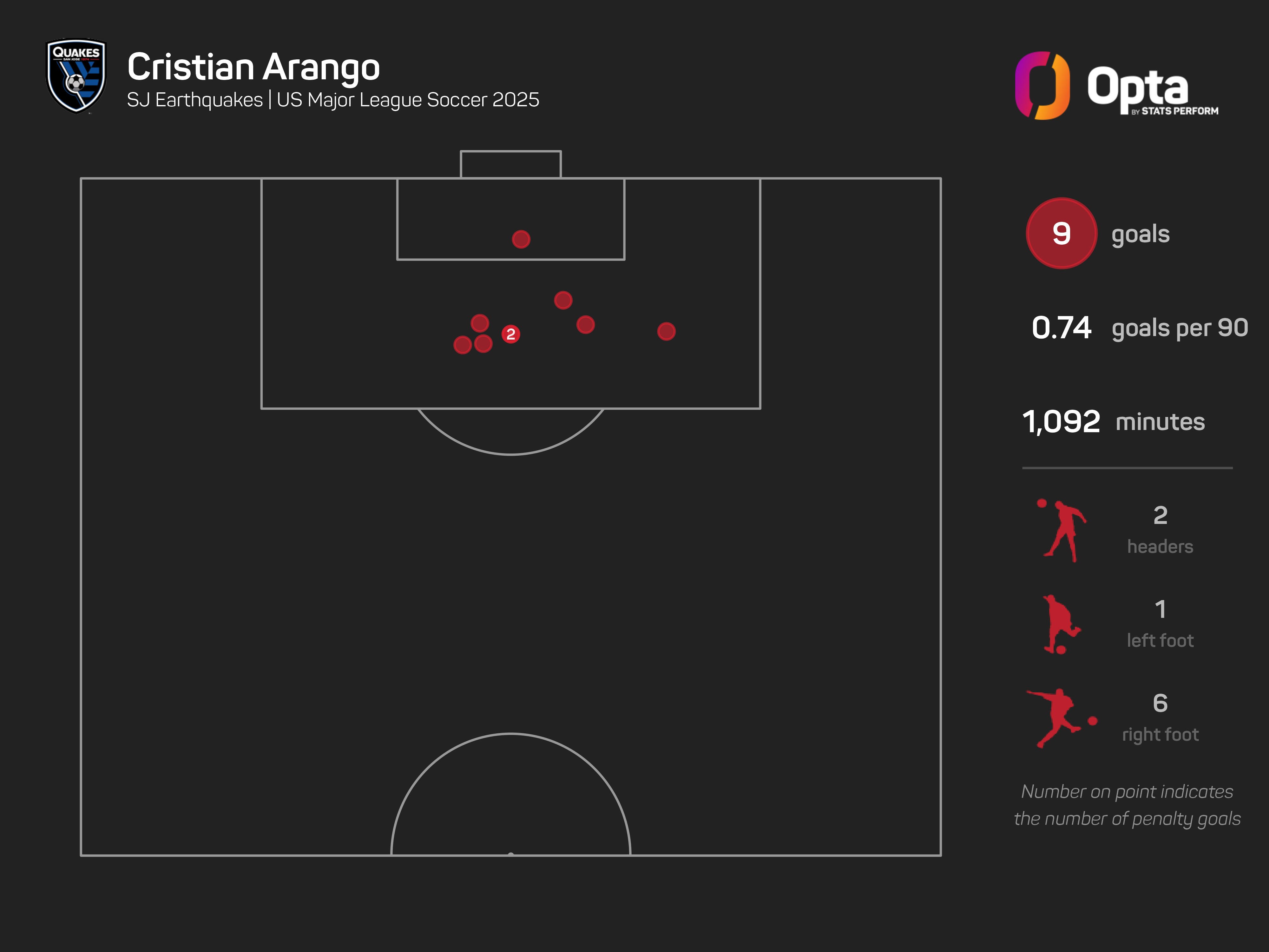 With his goal on Wednesday against Inter Miami, Arango has scored nine goals this season, the second most in MLS.