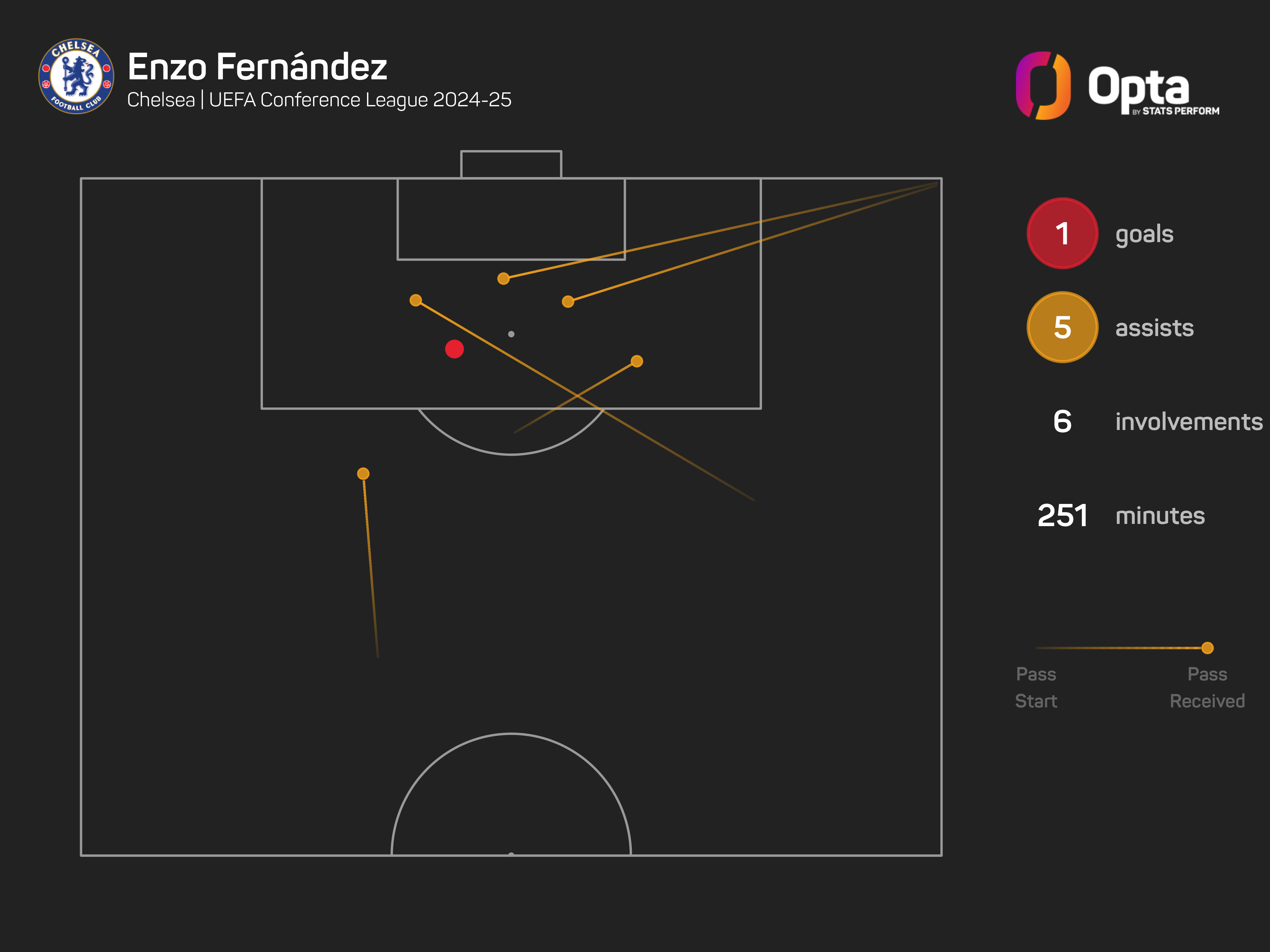 Only Seslar (eight) has more assists in the Conference League this season than Chelsea midfielder Fernandez (five), despite the Argentine playing just 251 minutes.