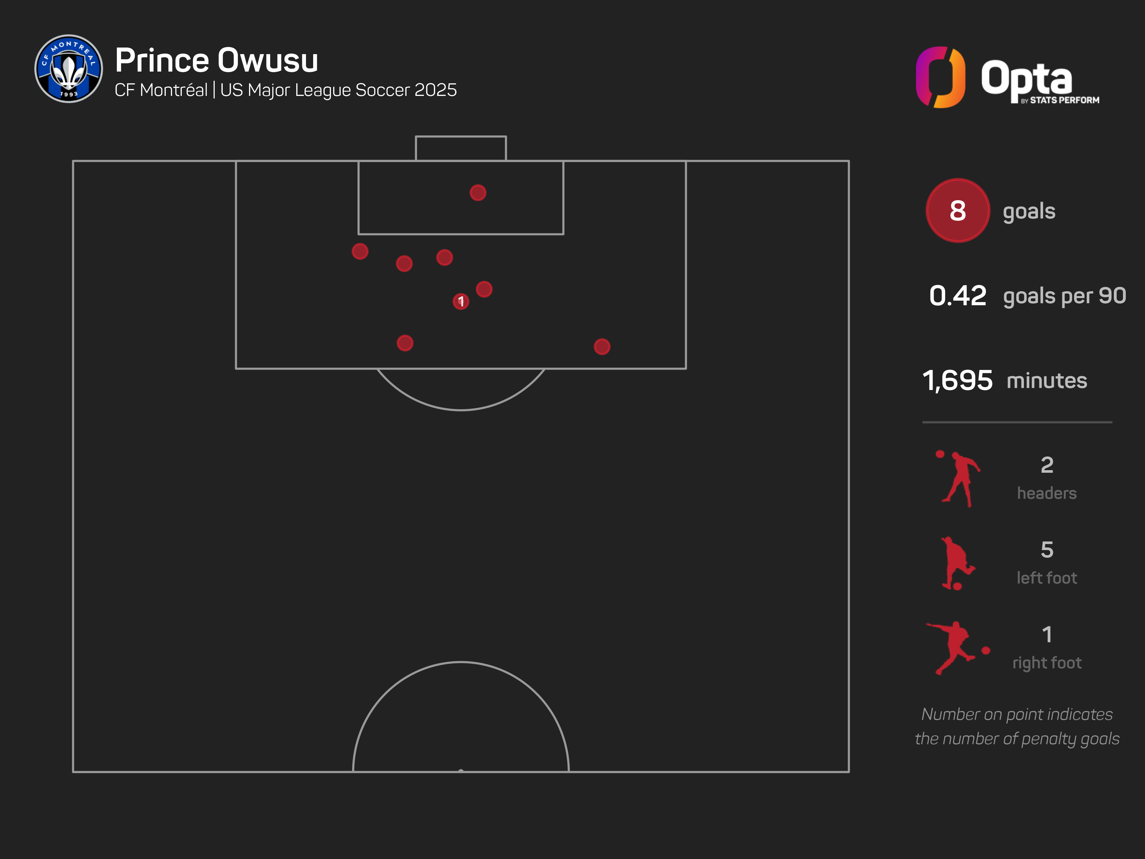 Owusu has scored eight of Montreal's 18 goals in the 2025 regular season, including a second-minute goal against Inter Miami on Saturday.