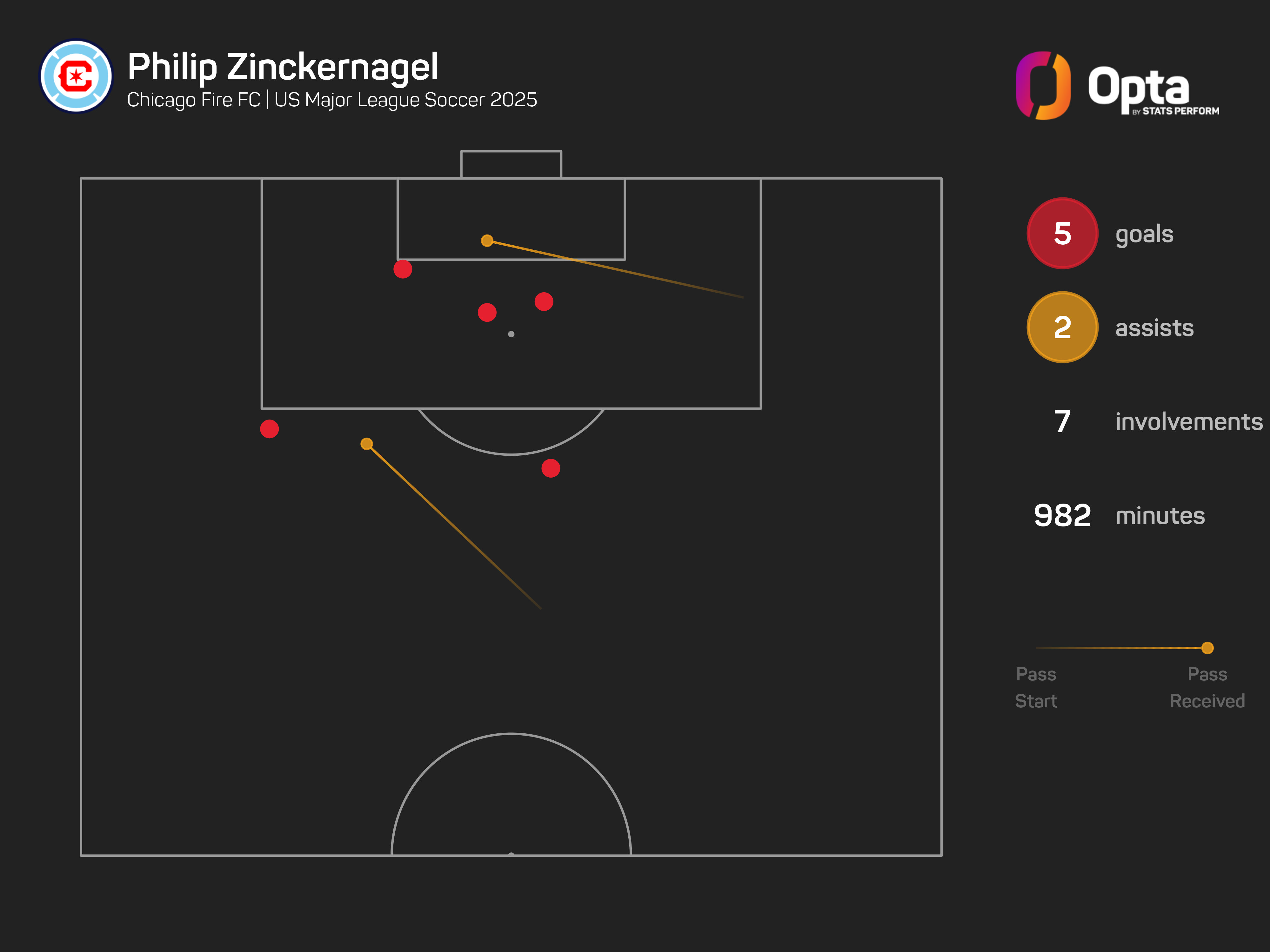 Zinckernagel has contributed to a goal in five straight regular-season away matches for the Fire, equalling the longest streak in club history.