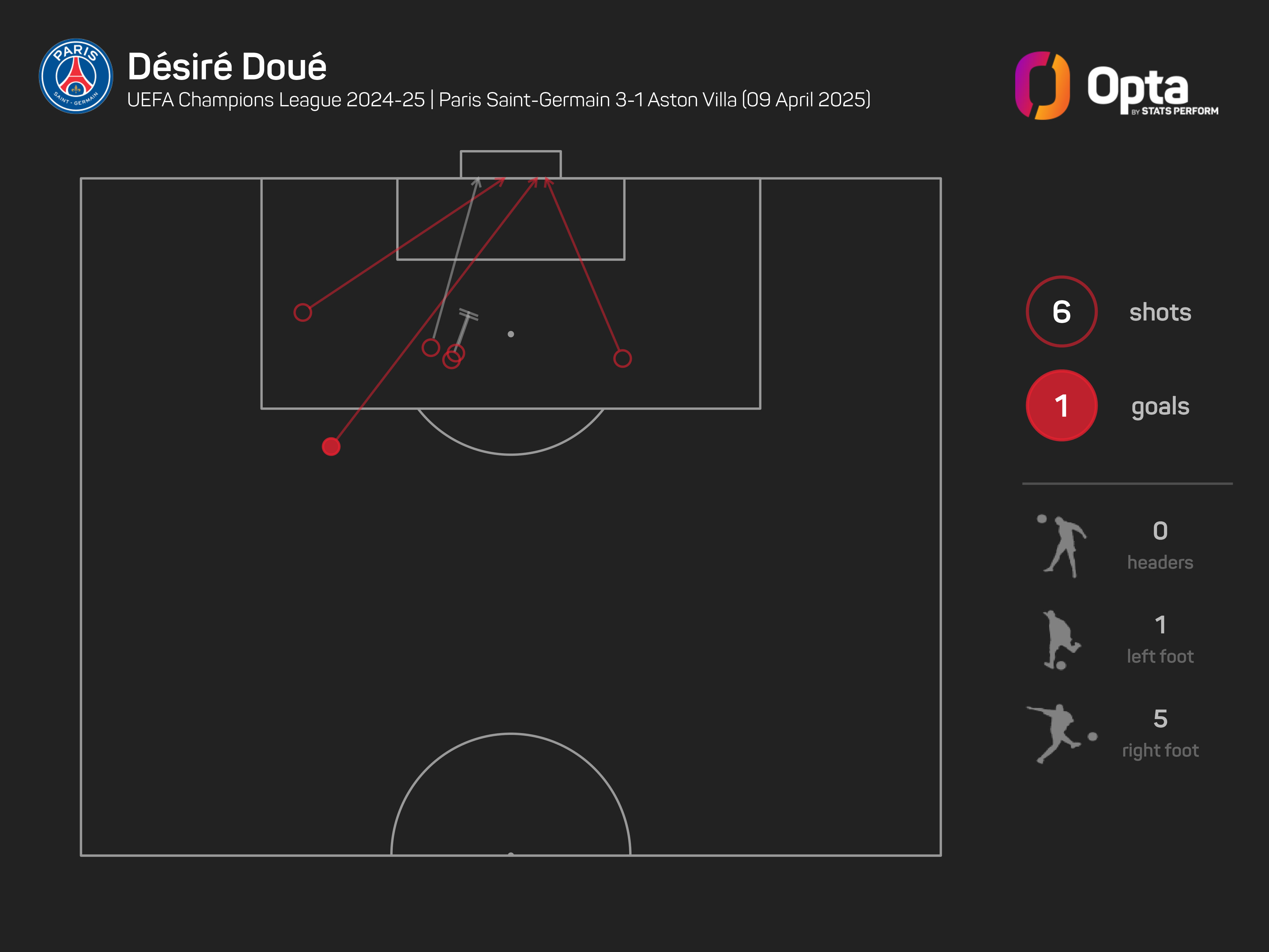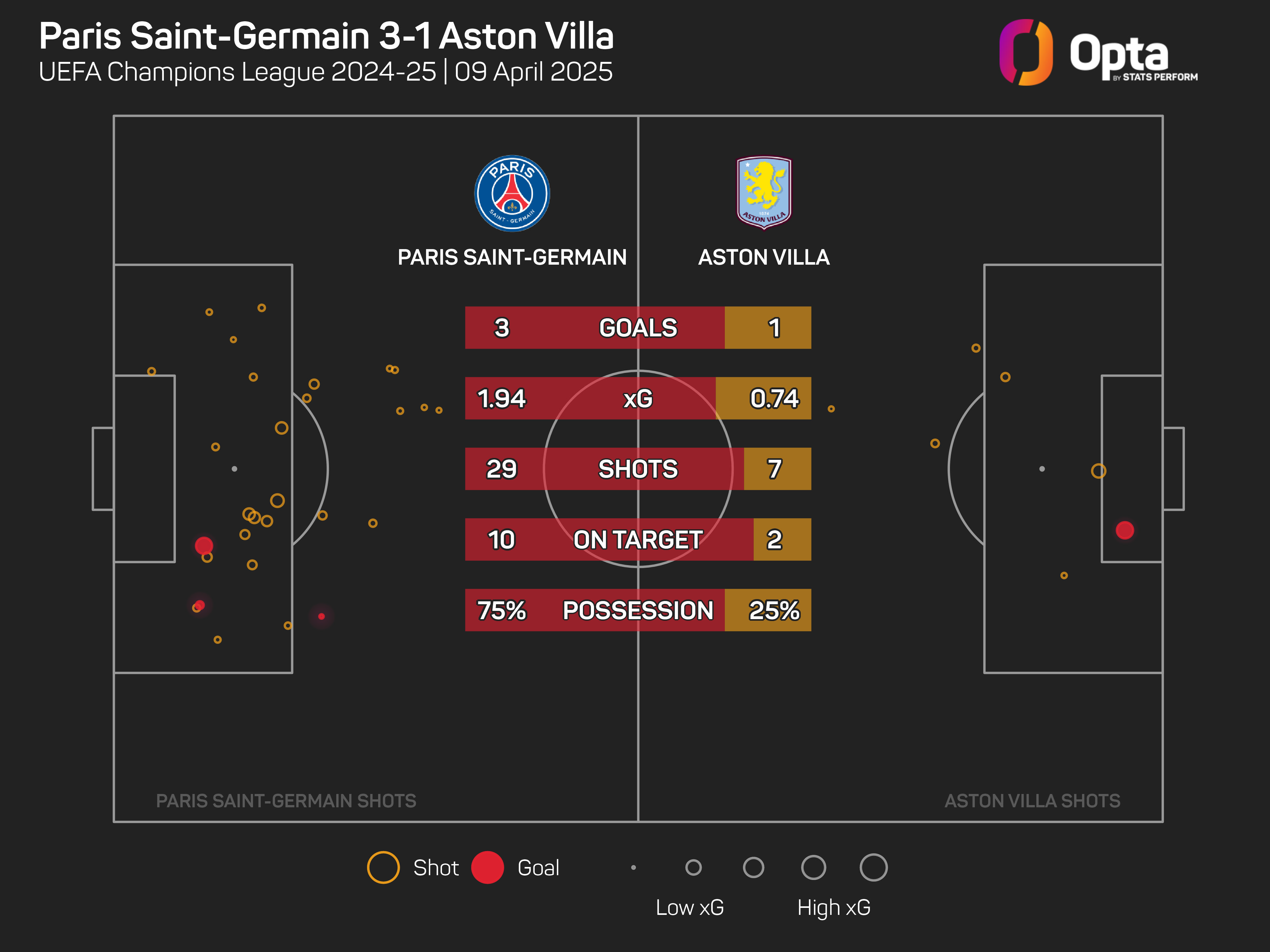 By full-time, PSG had attempted 29 shots to Villa's seven, with 19 of those coming from inside the box.