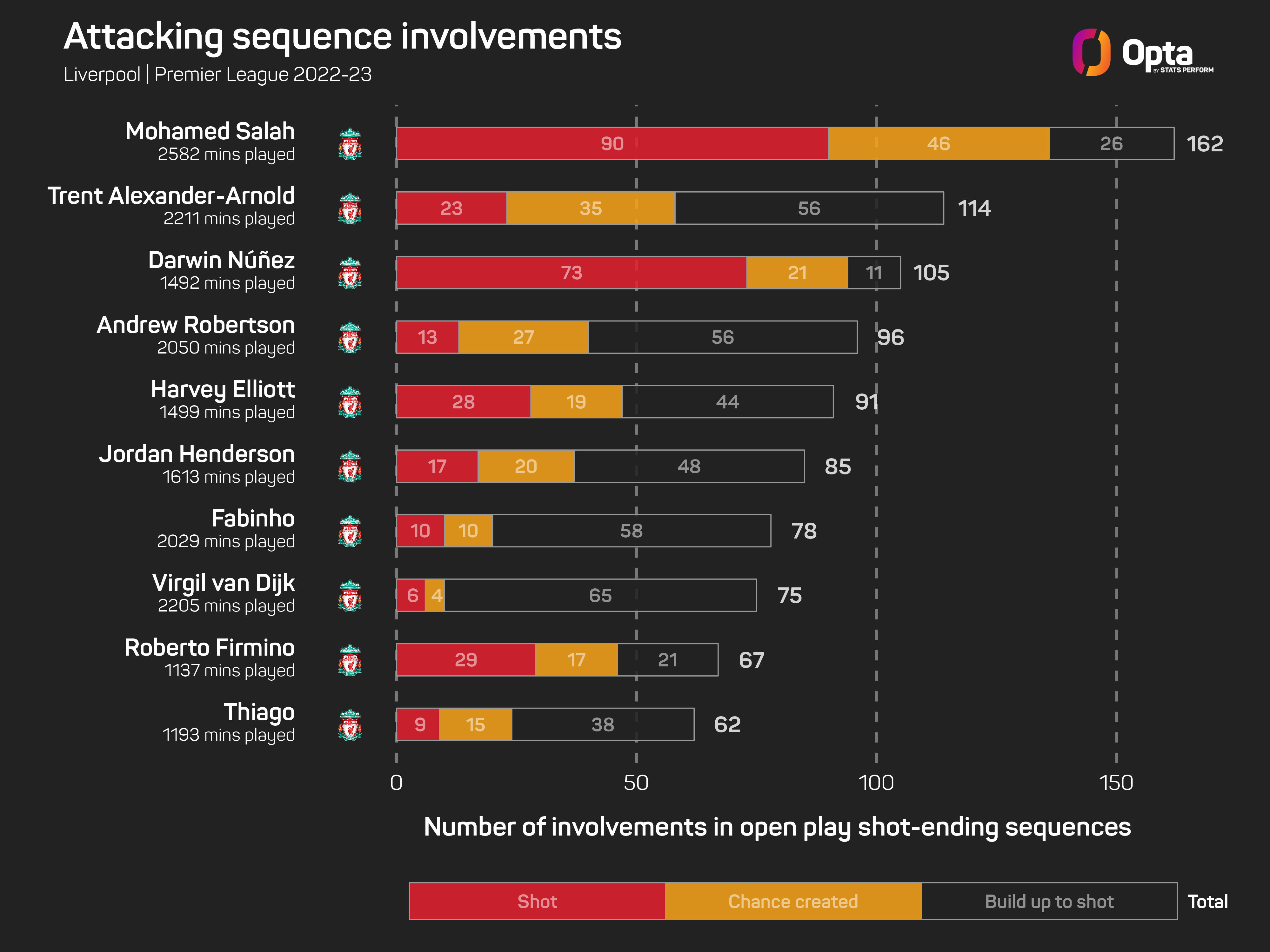 Only Ollie Watkins (14) and Erling Haaland (13) have been involved in more Premier League goals in 2023 than the Liverpool forward, with Salah totting up 11 involvements (8 goals, 3 assists), nine of which have come since the beginning of March.