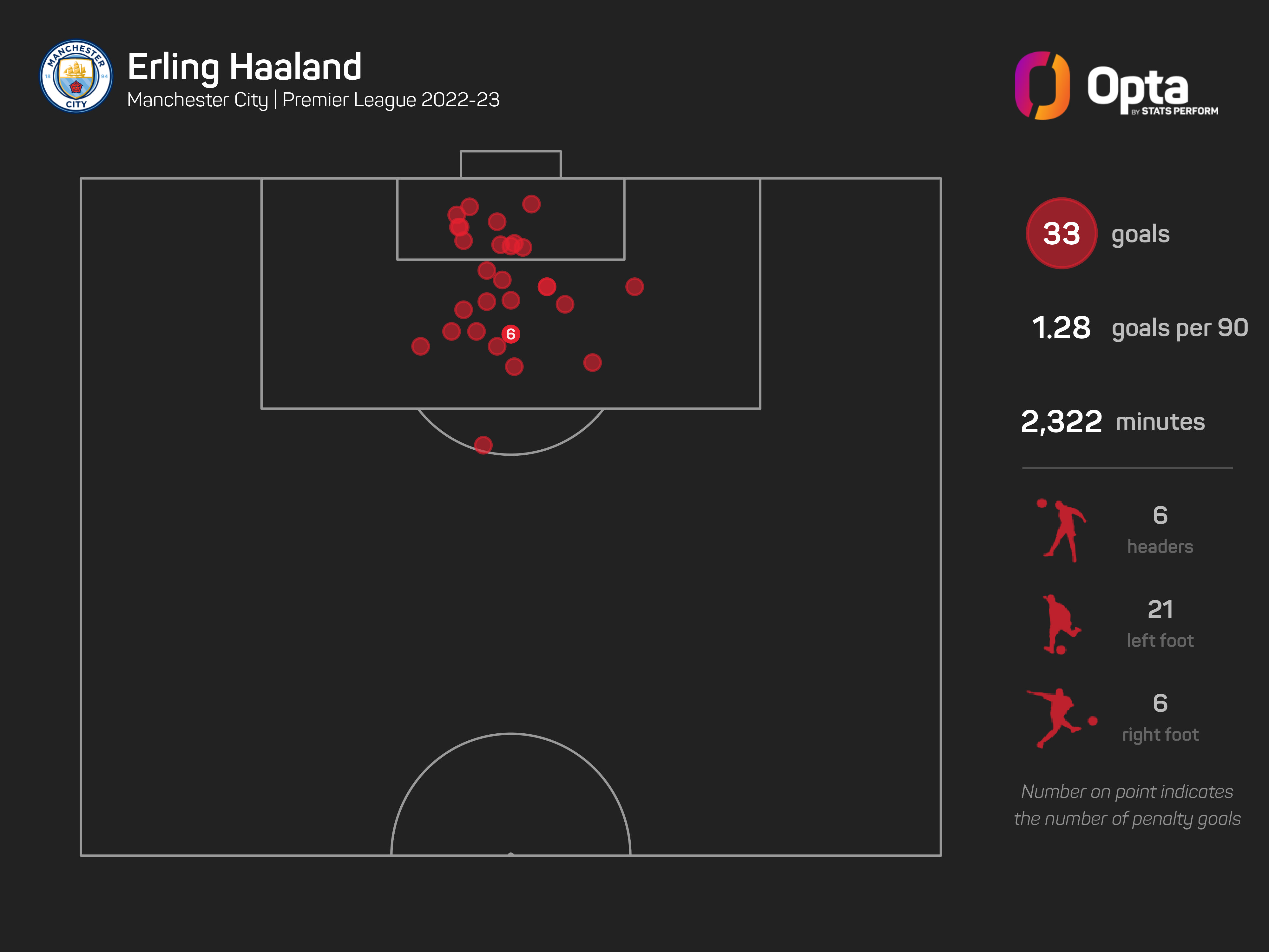 Erling Haaland has scored 33 Premier League goals for Manchester City this season, a record in a 38-game season. He is one away from equalling the overall record for a single season, set by Andrew Cole in 1993-94 and matched by Alan Shearer in 1994-95 (34 goals) in 42-game campaigns. This will be his 30th appearance in the competition, with his 33 goals already more than 21 teams managed in total in their first 30 Premier League games.