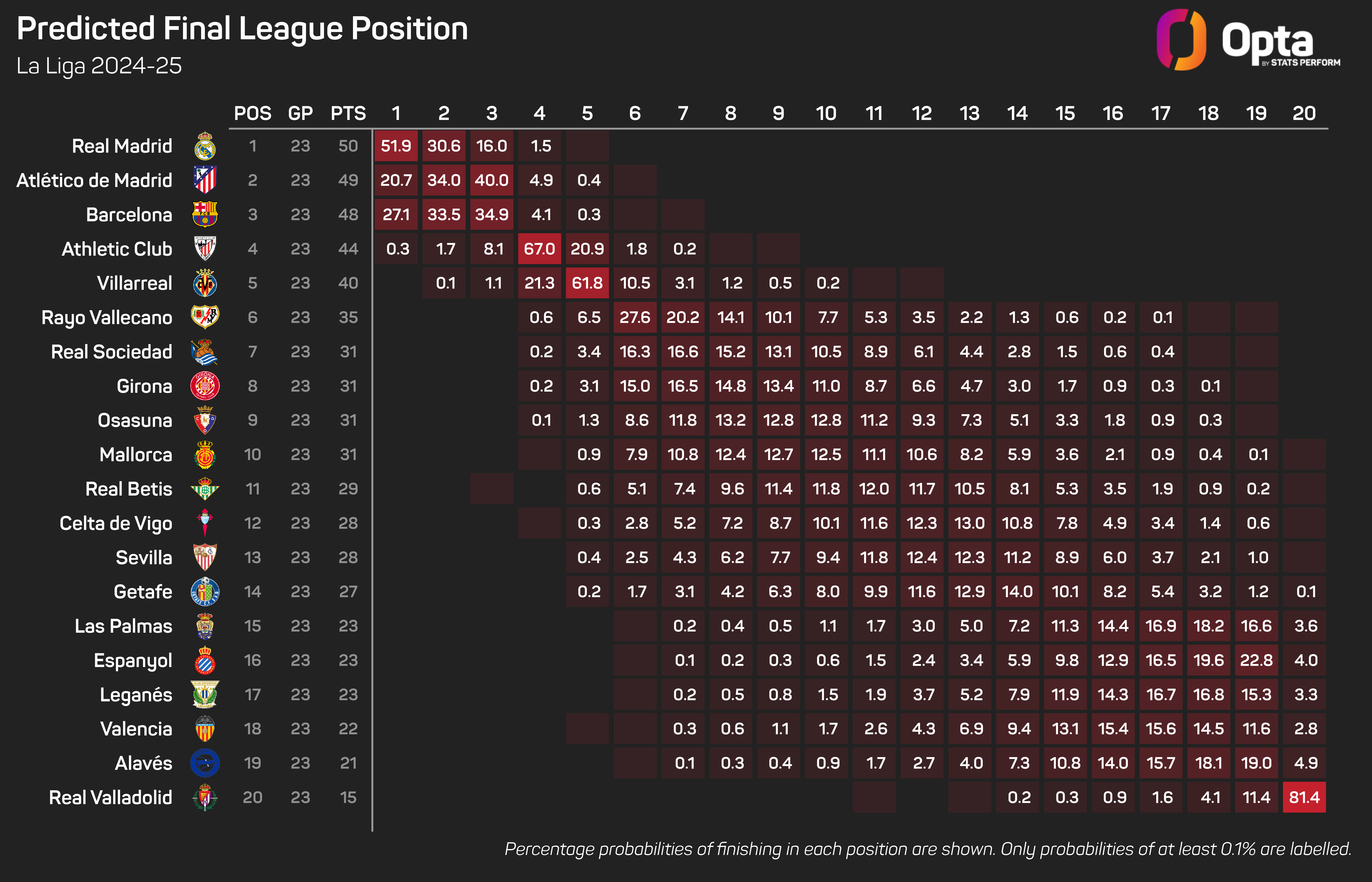 Madrid are made the favourites to win the title by Opta's model, with a 51.9% probability of finishing first. Atleti have a 20.7% chance, while Barca have a 27.1% chance.