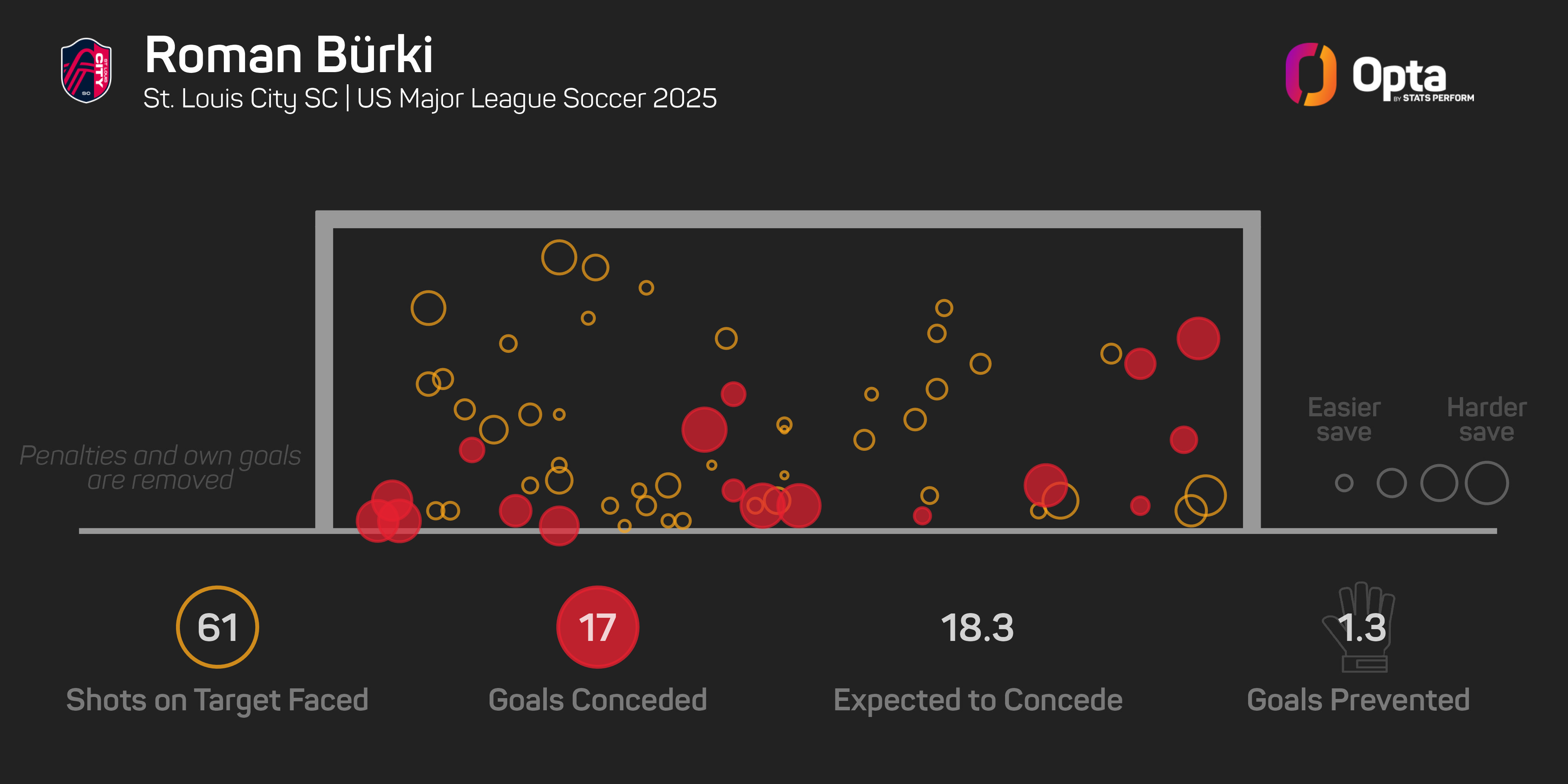 Burki has recorded at least five saves in a match for the 26th time since joining St. Louis ahead of the 2023 season with his performance last time out.