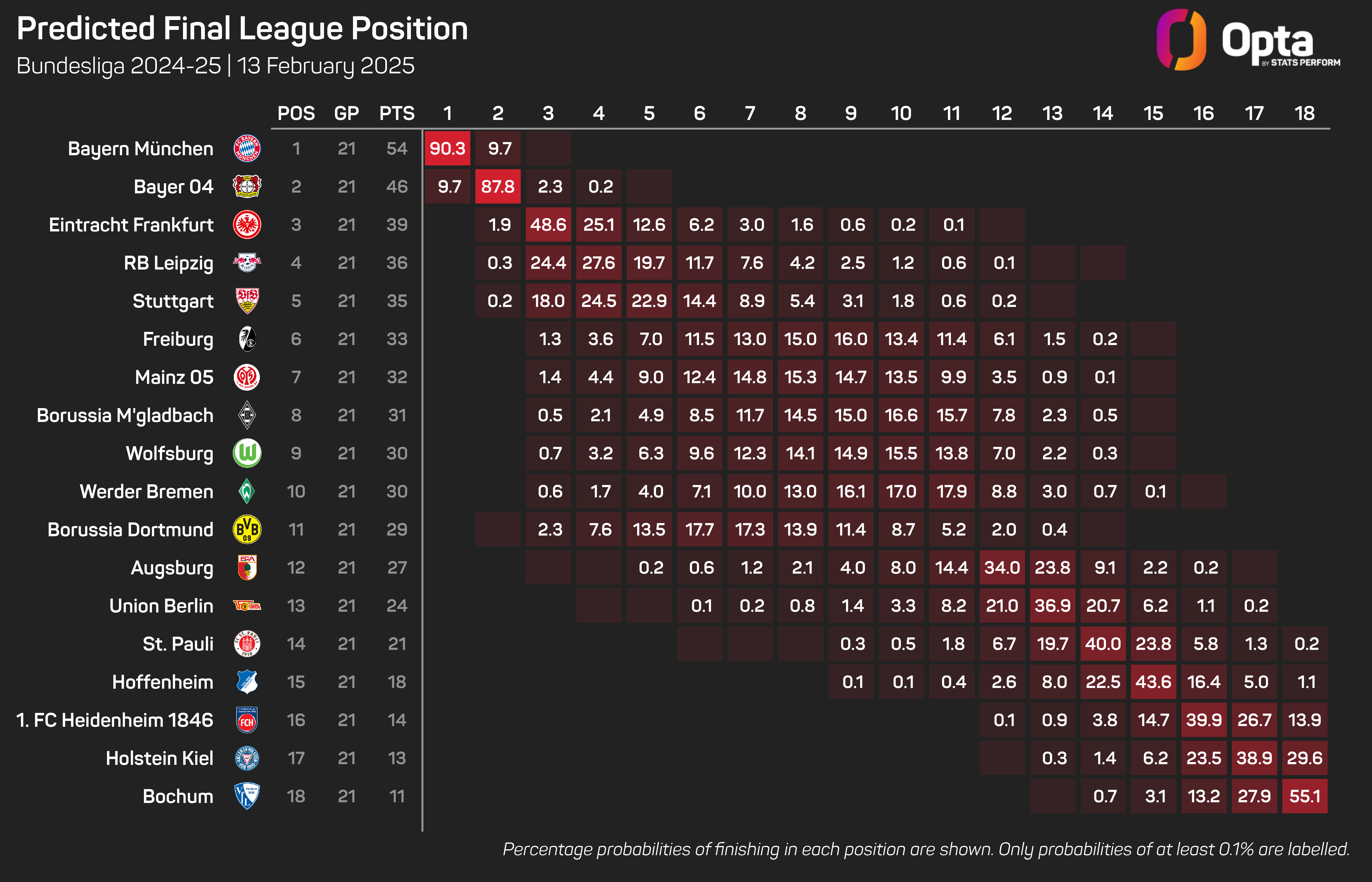 It also predicts that Kompany will guide Bayern to a 34th Bundesliga title, with 90.3% of the simulations seeing Die Roten finish top. Leverkusen, meanwhile, are given just a 9.7% chance of defending their crown.