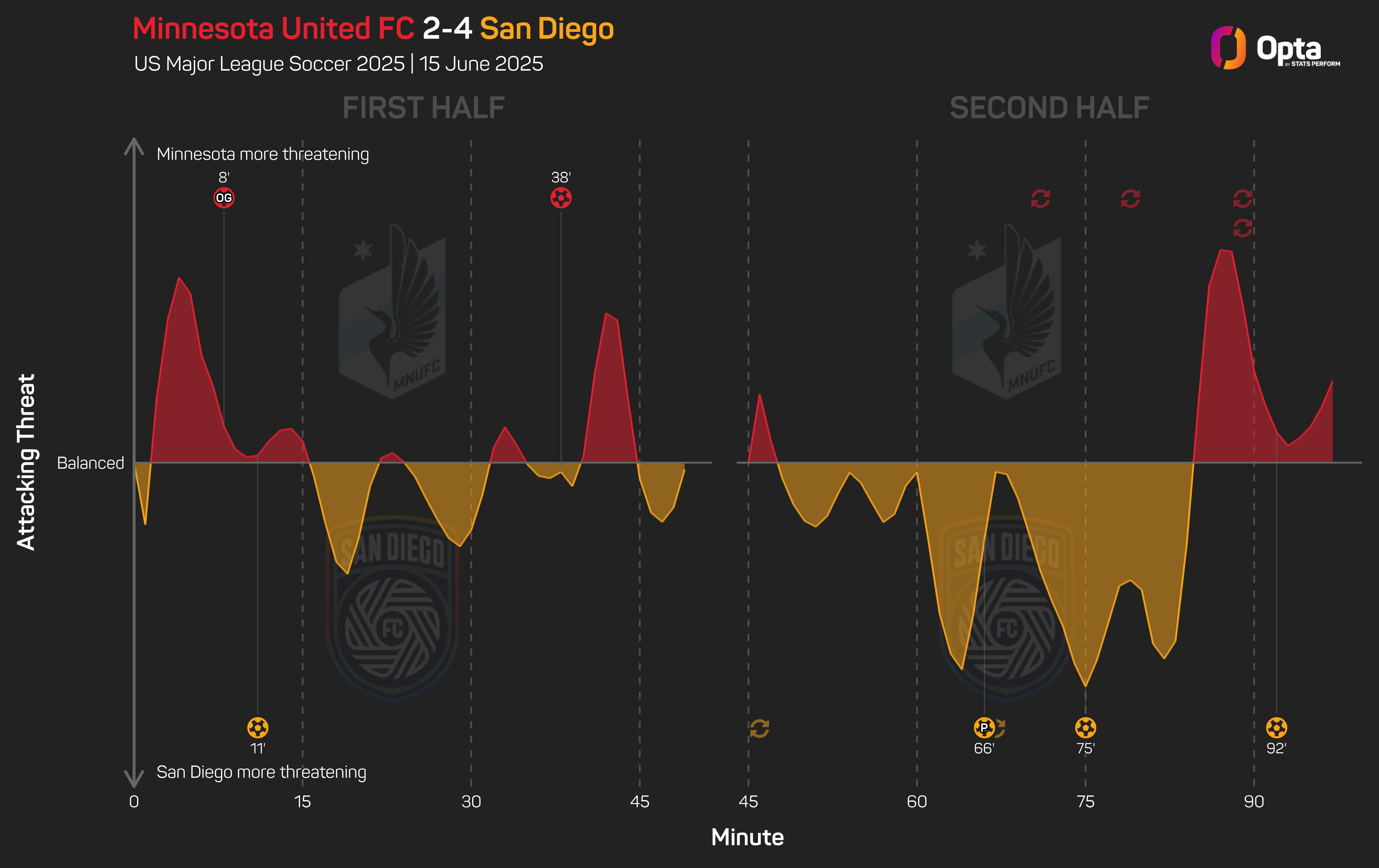 They had 15 shots overall against Eric Ramsay's side, getting seven of those on target, the most against Minnesota this season. They also accumulated 3.0 expected goals (xG), which they overperformed.