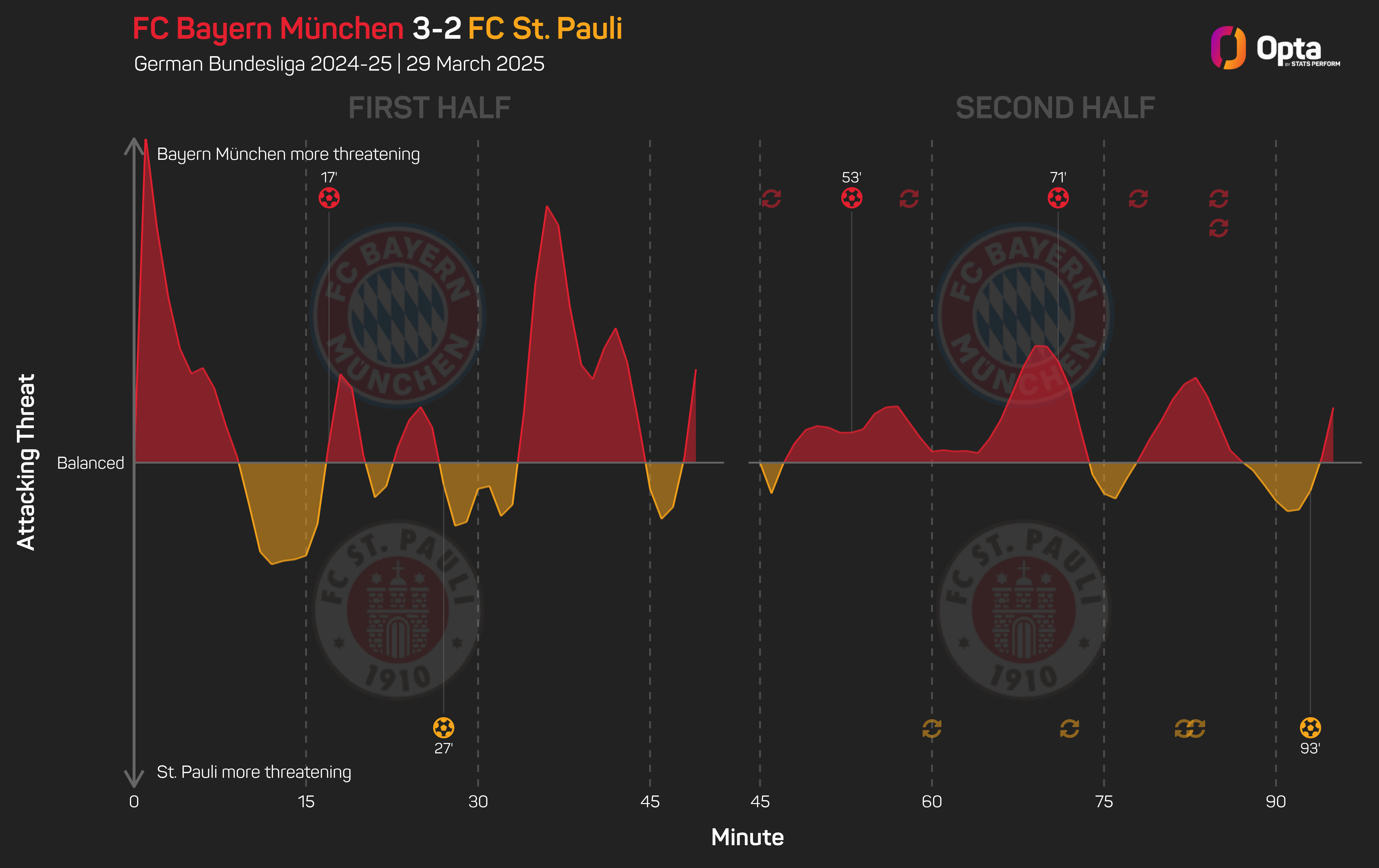 Bayern have now won nine of their last 10 competitive games against St. Pauli, only losing to them during this period in February 2002.