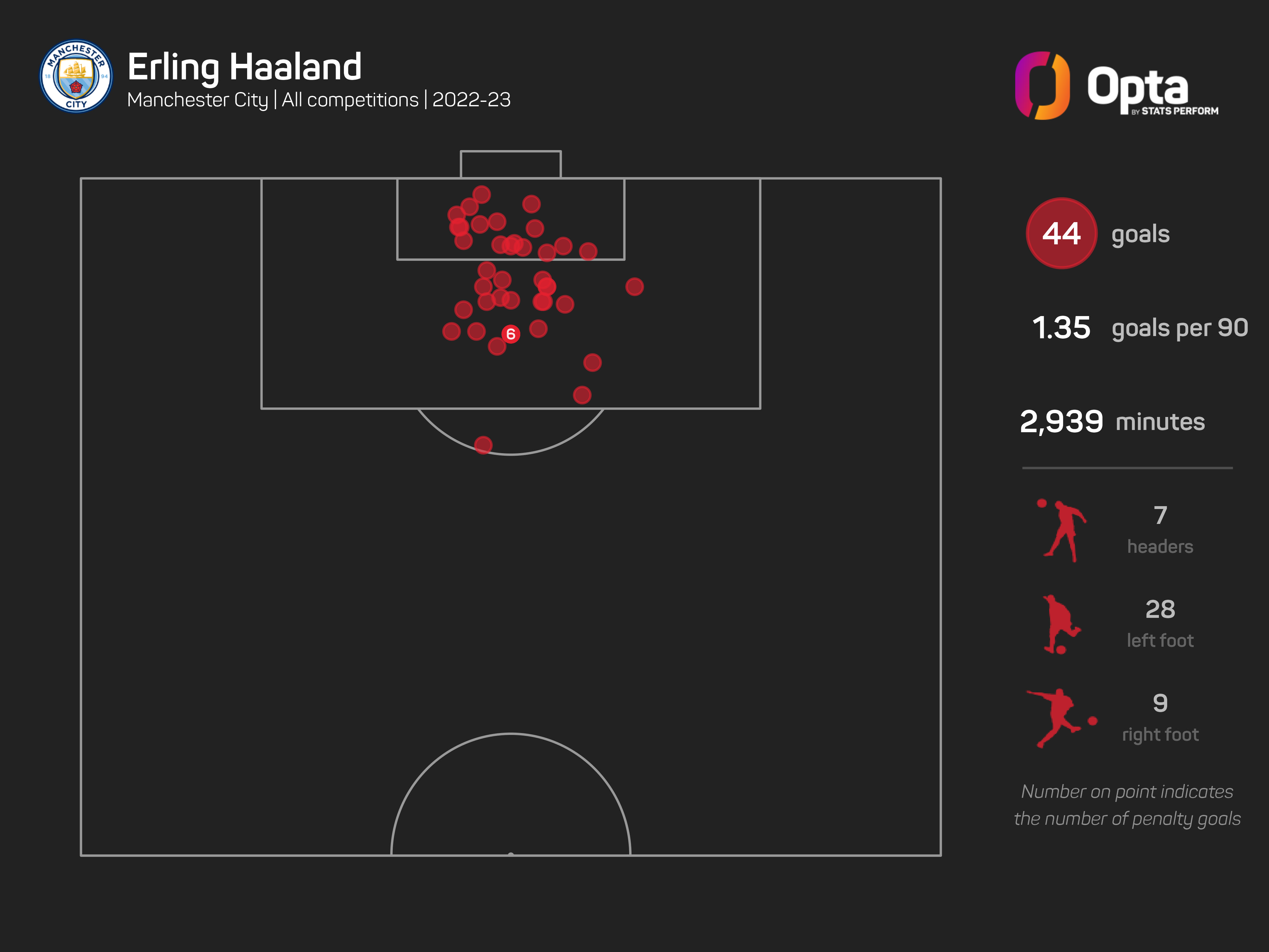 Haaland scored a brace in Saturday's win at Southampton to take his tally for the season in all competitions in his maiden campaign with City to 44 goals in 38 games.