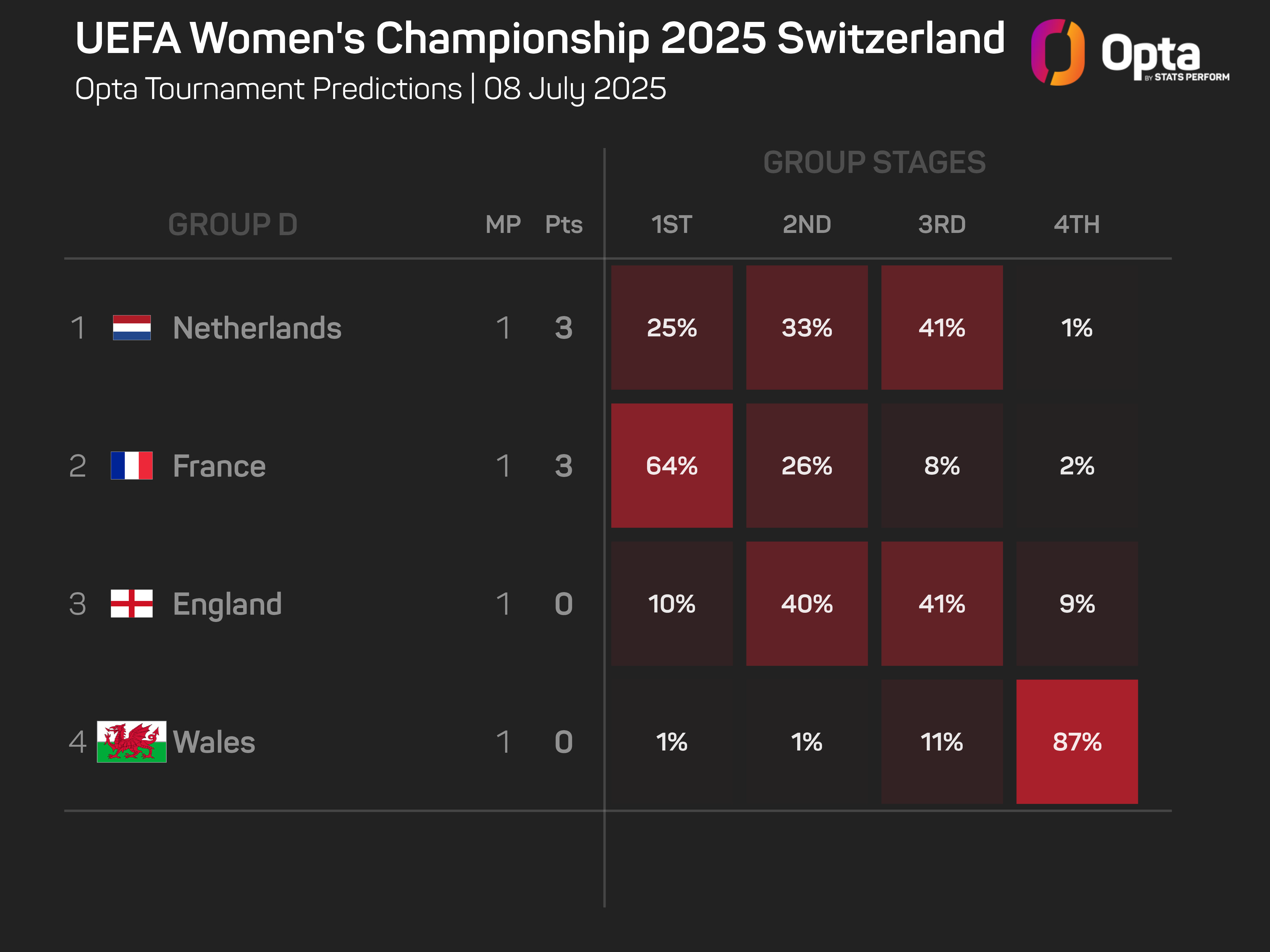 The Opta supercomputer hands England a 50% chance of finishing in the top two and advancing to the knockout stages, compared to the Netherlands' 58% and France's 90%.