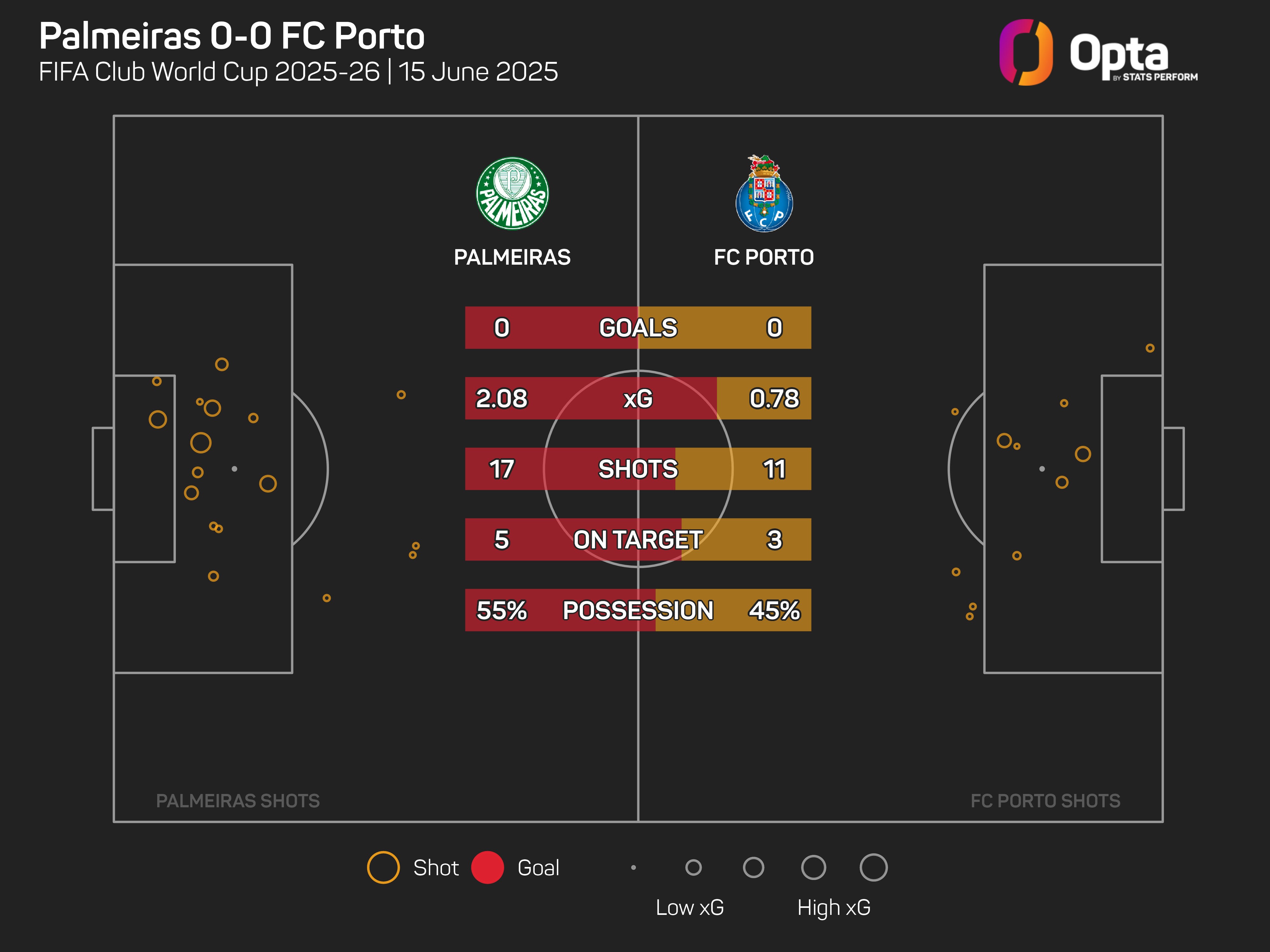 Palmeiras were the dominant side, creating chances worth 2.1 expected goals. That is the highest xG conceded by a side in a Club World Cup game in which they also kept a clean sheet, with Porto's stand-in goalkeeper Claudio Ramos making a string of fine stops as he deputised for the injured Diogo Costa.