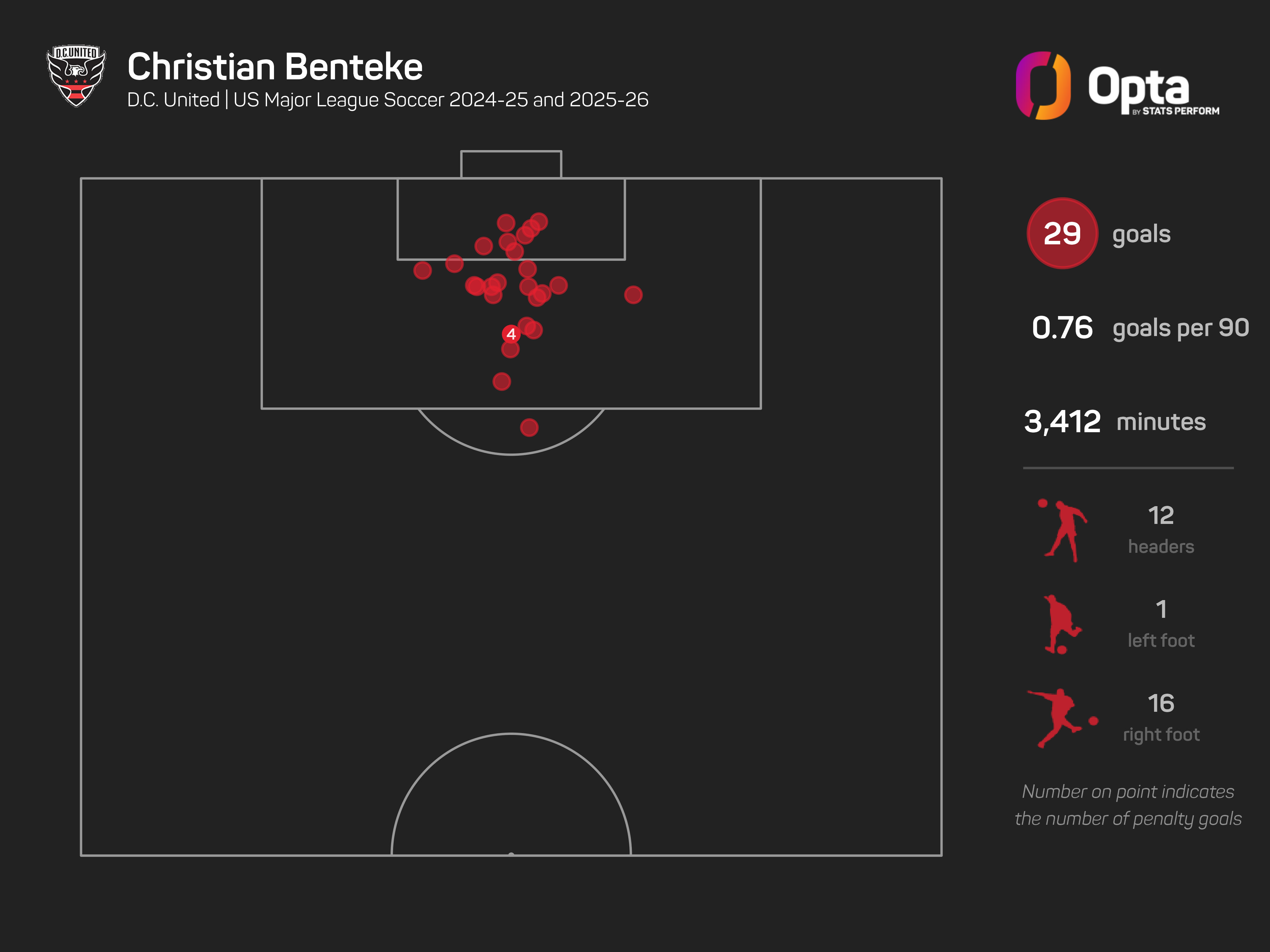 Benteke scored his 29th regular-season goal since the start of the 2024 season on Saturday, five more than any other player.