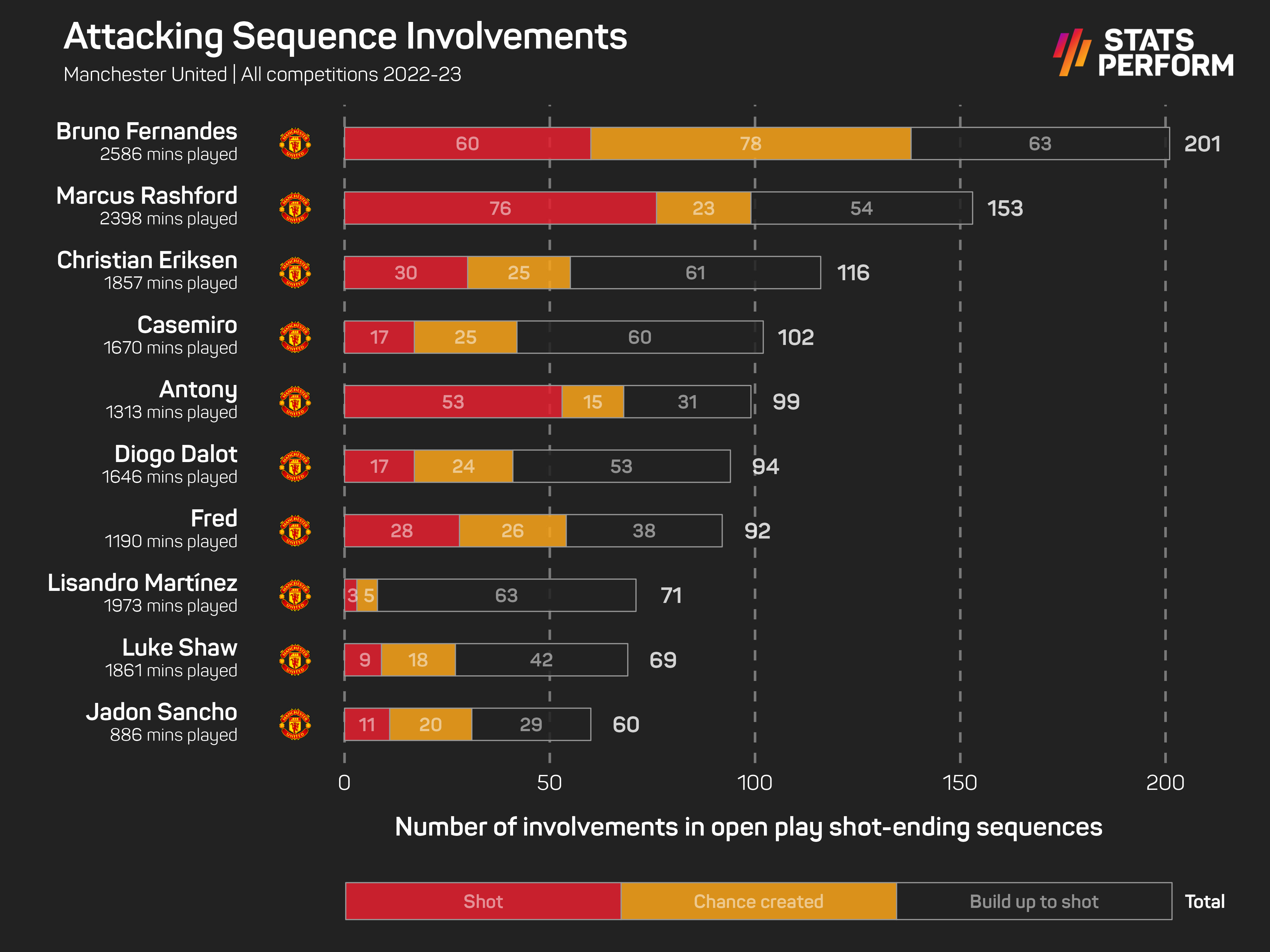 He has produced all-round performances for United though since arriving from Real Madrid, with only Bruno Fernandes (201), Marcus Rashford (153) and Christian Eriksen (116) recording more than his 102 attacking sequence involvements, with all three having played more minutes than him.