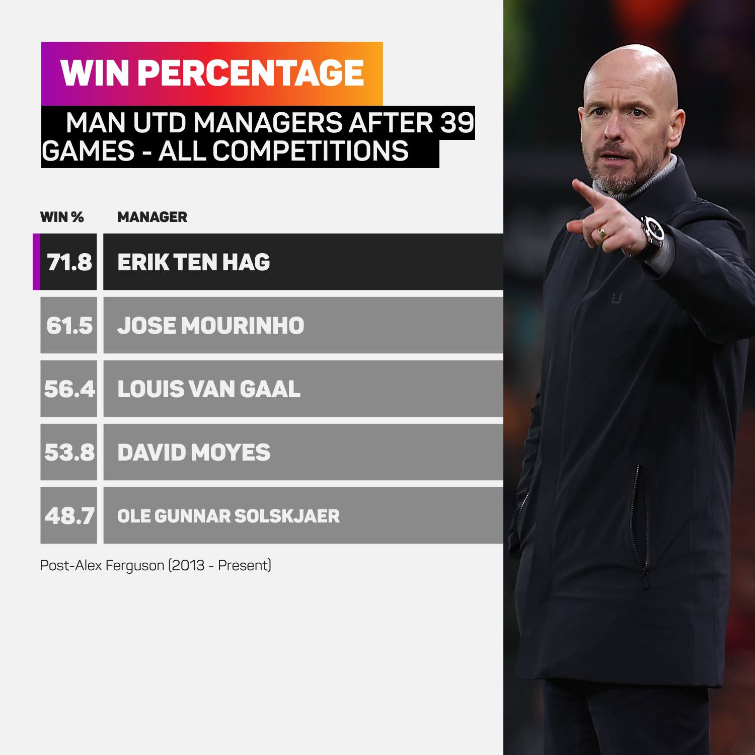 Between Ferguson leaving and Ten Hag arriving, United have had Moyes, Louis van Gaal, Jose Mourinho and Solskjaer as permanent managers, none of whom had a win percentage as high after their first 39 games, with only Mourinho's above 60 per cent (61.5).