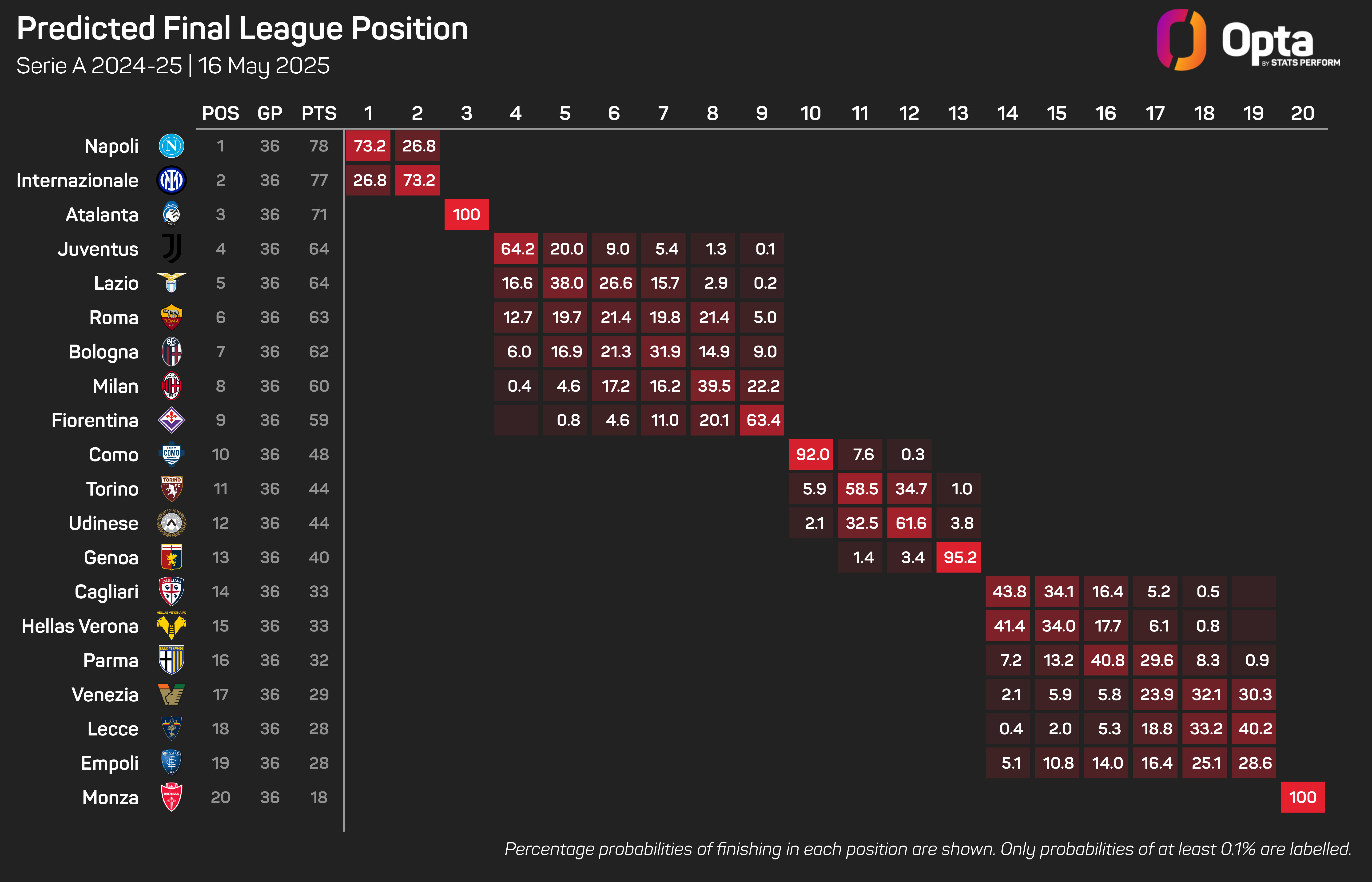 Juventus face a battle to hold onto fourth spot, though they are given a 64.2% chance of finishing there by the Opta supercomputer.